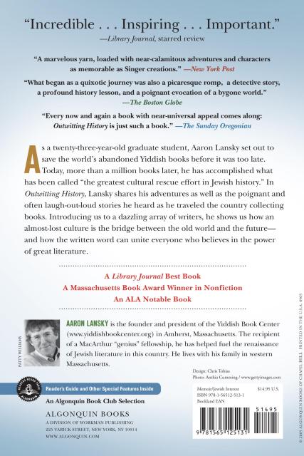 As a twenty-three-year-old graduate student, Aaron Lansky set out to save the world’s abandoned Yiddish books before it was too late. Today, more than a million books later, he has accomplished what has been called “the greatest cultural rescue effort in Jewish history.” In Outwitting History, Lansky shares his adventures as well as the poignant and often laugh-out-loud stories he heard as he traveled the country collecting books. Introducing us to a dazzling array of writers, he shows us how an almost-lost culture is the bridge between the old world and the future—and how the written word can unite everyone who believes in the power of great literature.