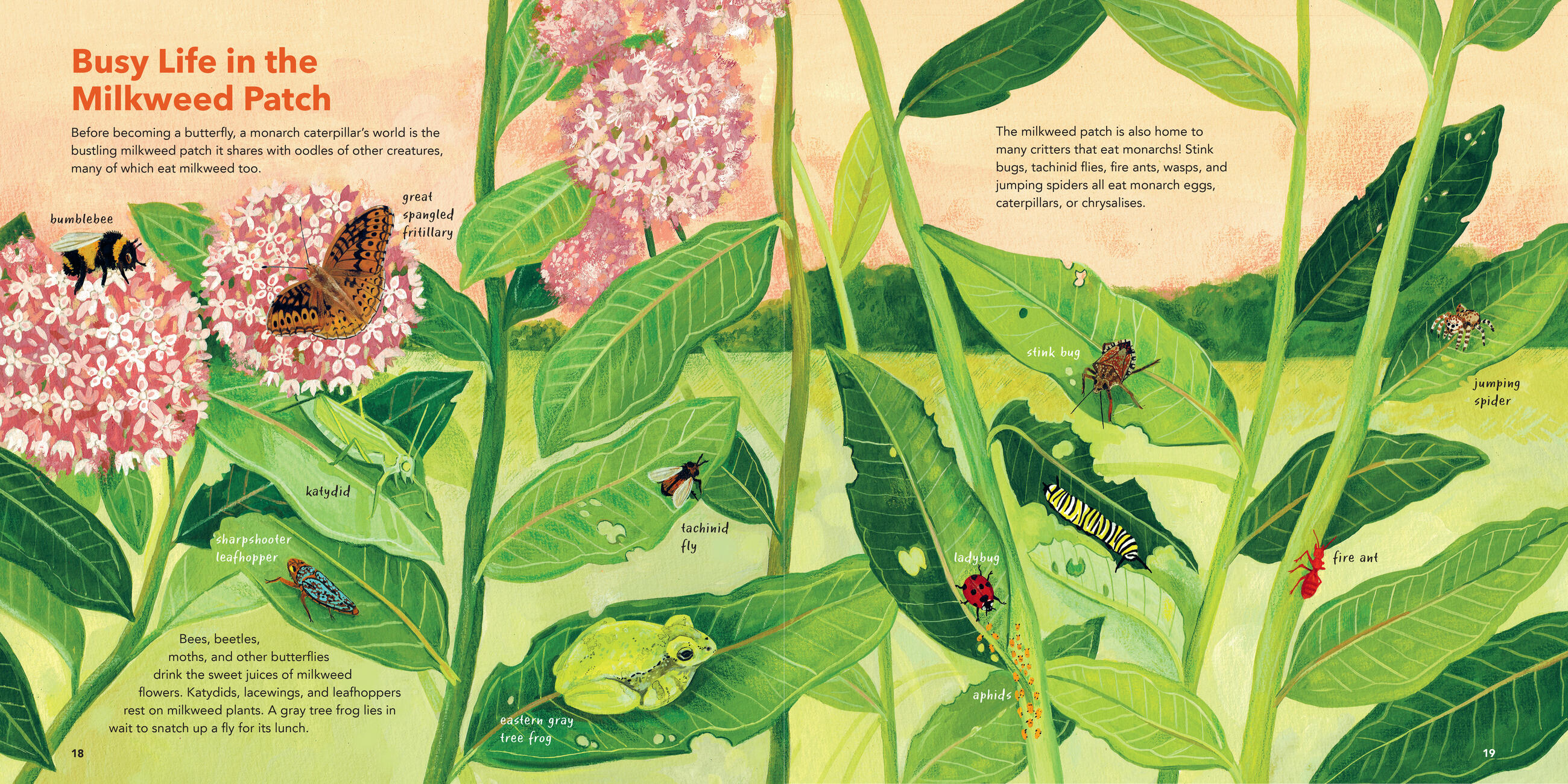 “Soaring color and an elegant flow of information fly high together in Hobbie’s robustly beautiful book. Baumert’s vibrant natural palette is rich in botanical detail, lush in evocative background landscape, factual yet charming in biological renderings. Readers will certainly conclude that the world is much more colorful with monarchs in it, just the inspiration needed for budding environmental stewards.” — Claudia McGehee, author and illustrator of North Woods Girl and Begin with a Bee