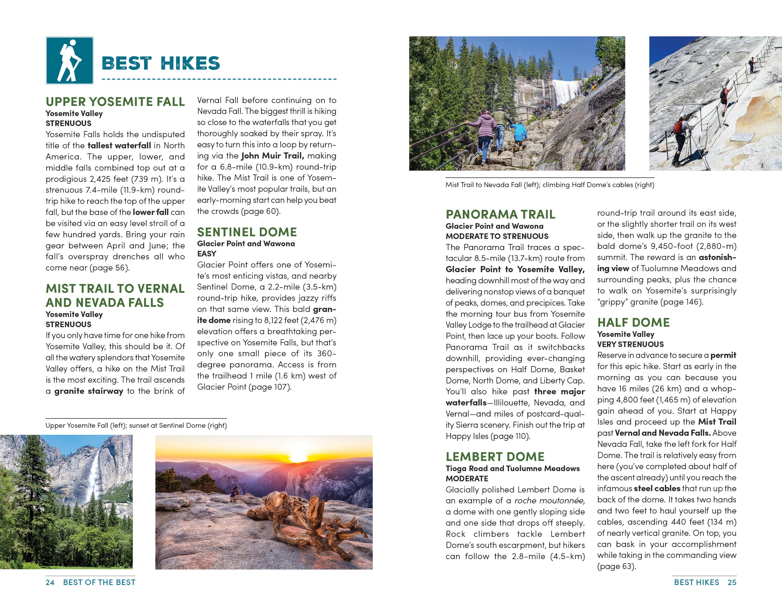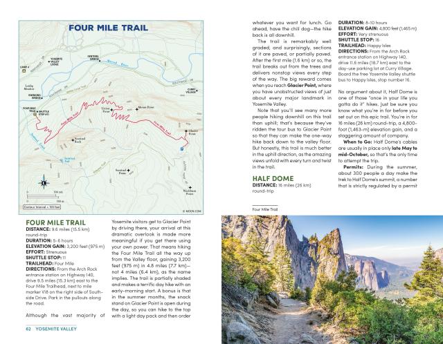 - The top hikes in Yosemite: Whether you’re looking to stretch your legs for a couple hours or challenge yourself to an epic trek, you’ll find trailheads, detailed trail descriptions, individual maps, mileage, and elevation gains