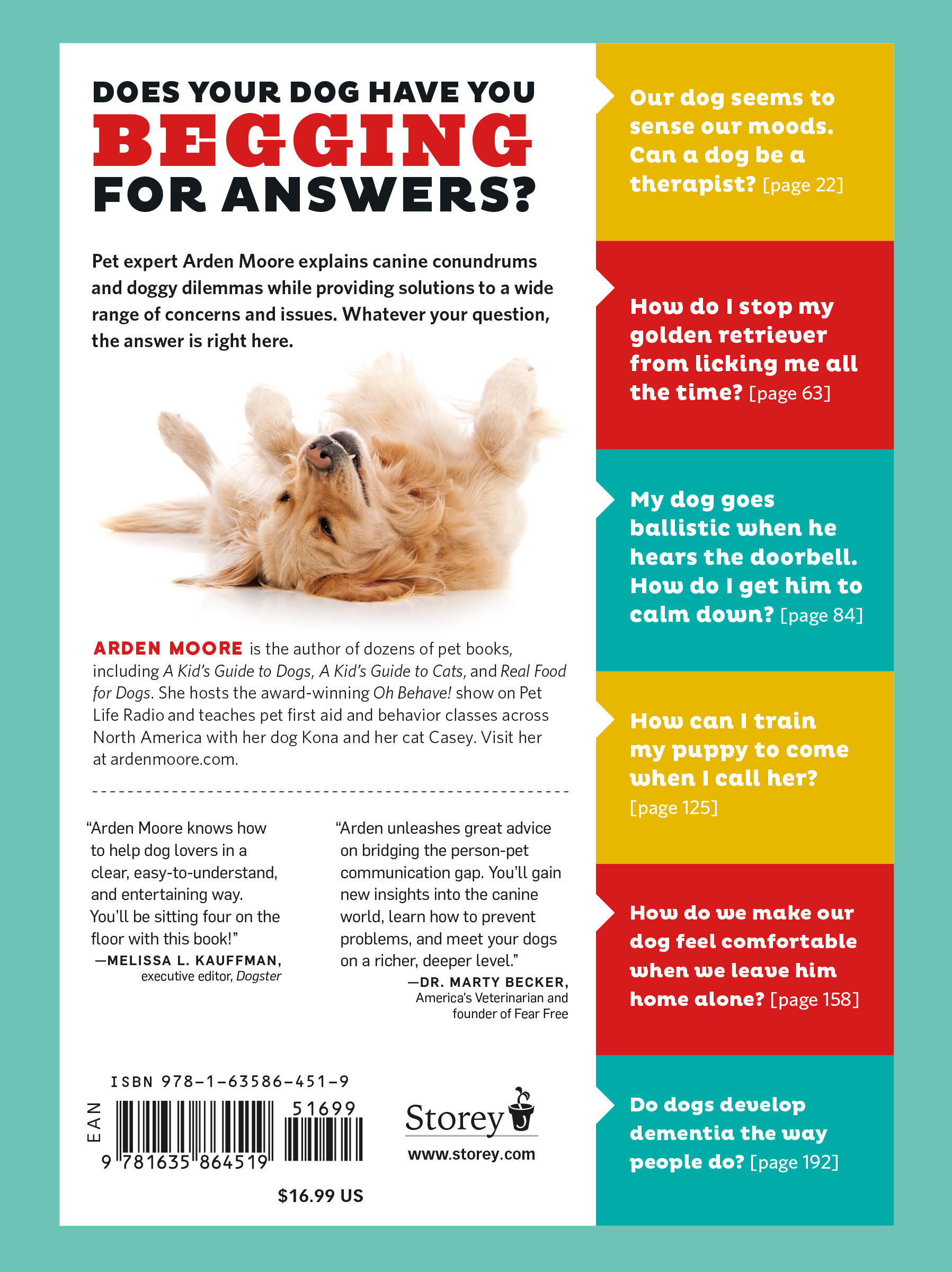 “It's hard enough for different people to live together let alone different species. What people often regard as doggy misdeeds are simply cases of dogs being dogs. In the Dog Behavior Answer Book, pet expert Arden Moore unleashes great advice on how to bridge the people-pet communication gap. Read this incredible book and you'll learn new insights into the canine world, prevent problems, and meet your dogs on a richer, deeper level. Go fetch this book!”— Dr. Marty Becker, America's Family Veterinarian and founder of Fear Free Pets
