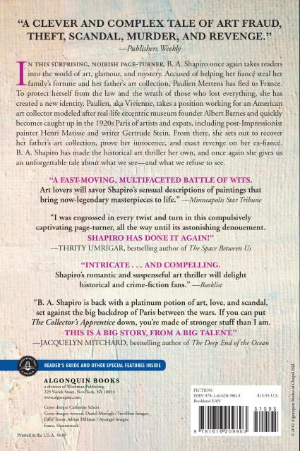 In this surprising, noirish page-turner, B. A. Shapiro once again takes readers into the world of art, glamour, and mystery. Accused of helping her fiancé steal her family’s fortune and her father’s art collection, Paulien Mertens has fled to France. To protect herself from the law and the wrath of those who lost everything, she has created a new identity. Paulien, aka Vivienne, takes a position working for an American art collector modeled after real-life eccentric museum founder Albert Barnes and quickly becomes caught up in the 1920s Paris of artists and expats, including post-Impressionist painter Henri Matisse and writer Gertrude Stein. From there, she sets out to recover her father’s art collection, prove her innocence, and exact revenge on her ex-fiancé. B. A. Shapiro has made the historical art thriller her own, and once again she gives us an unforgettable tale about what we see—and what we refuse to see.