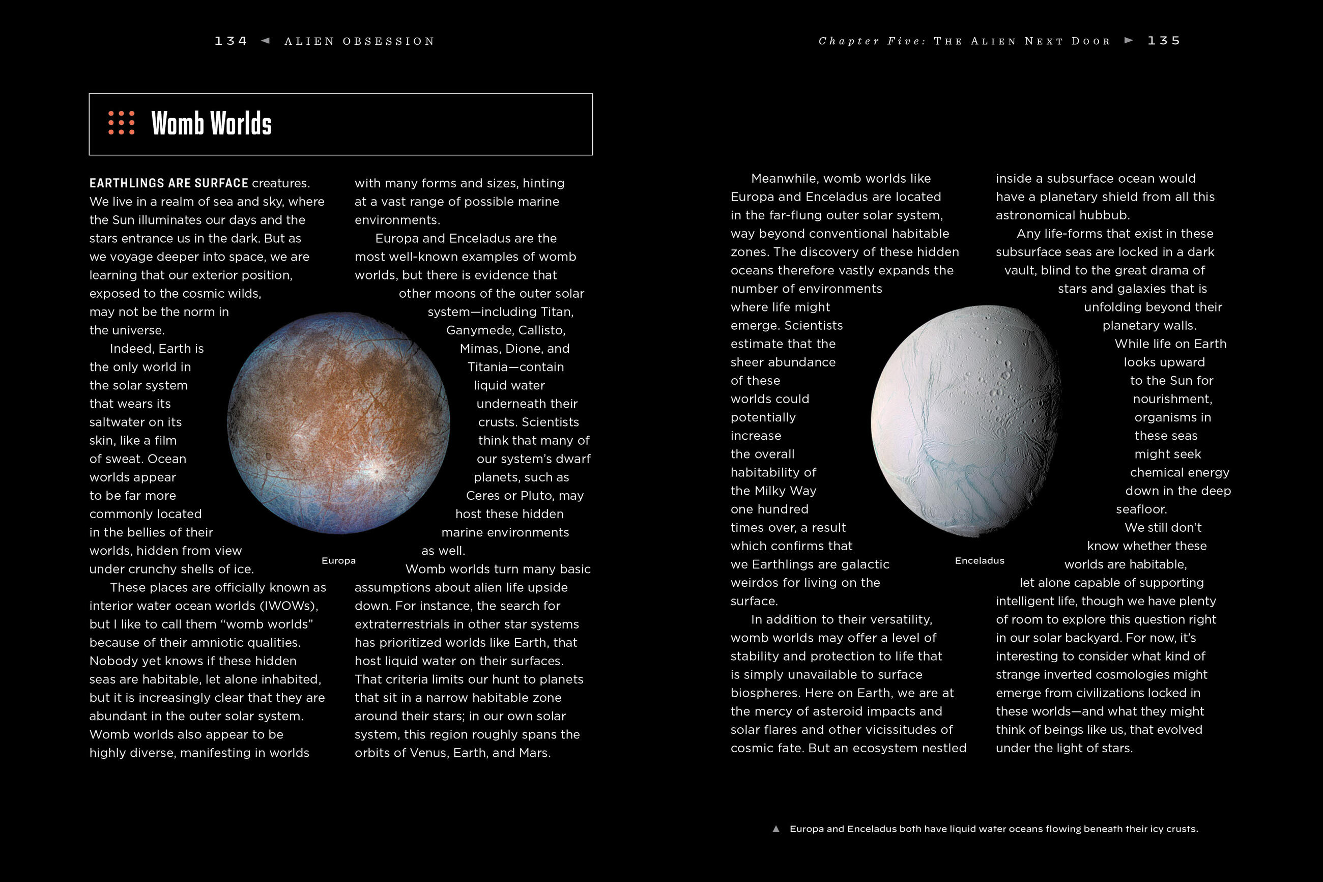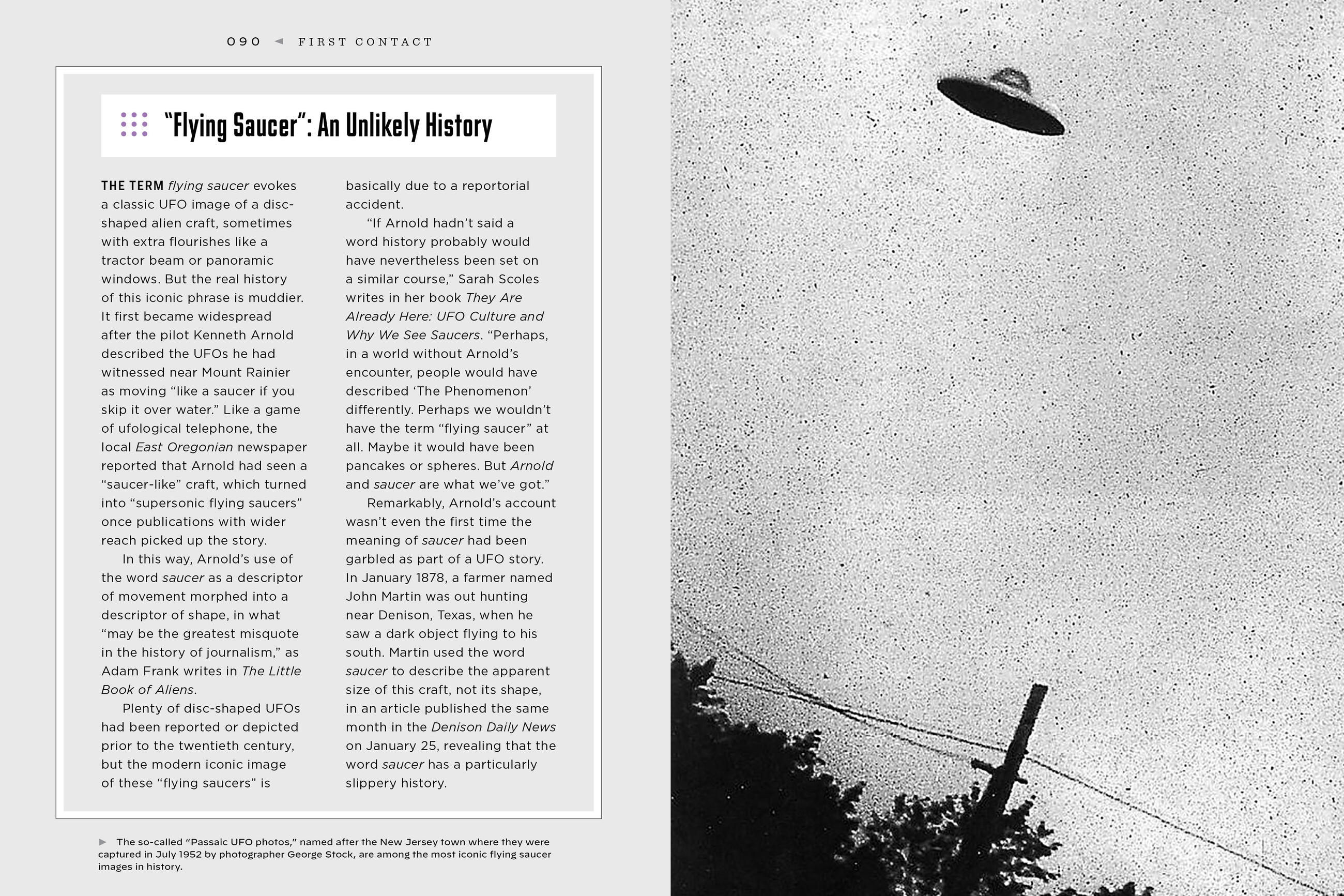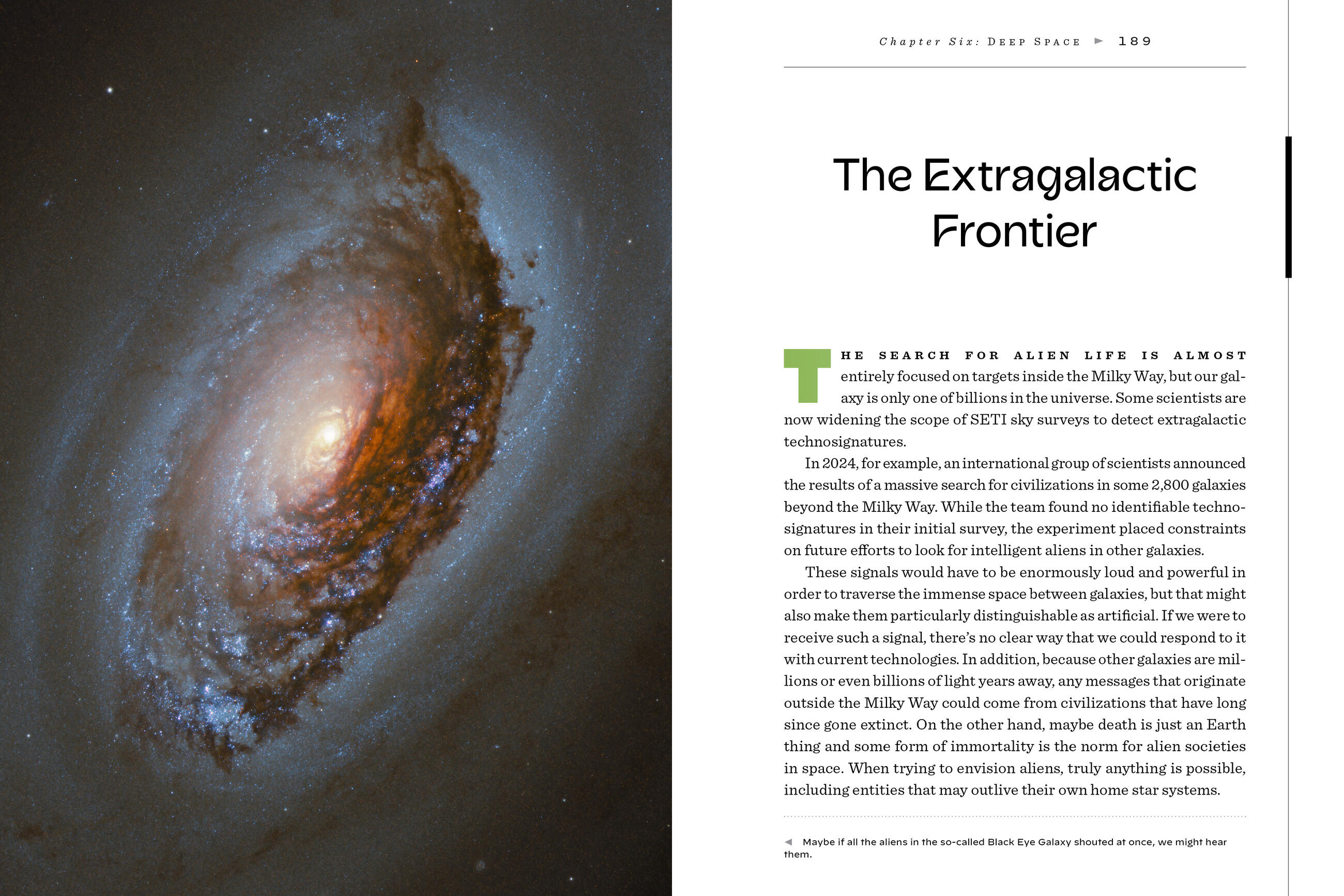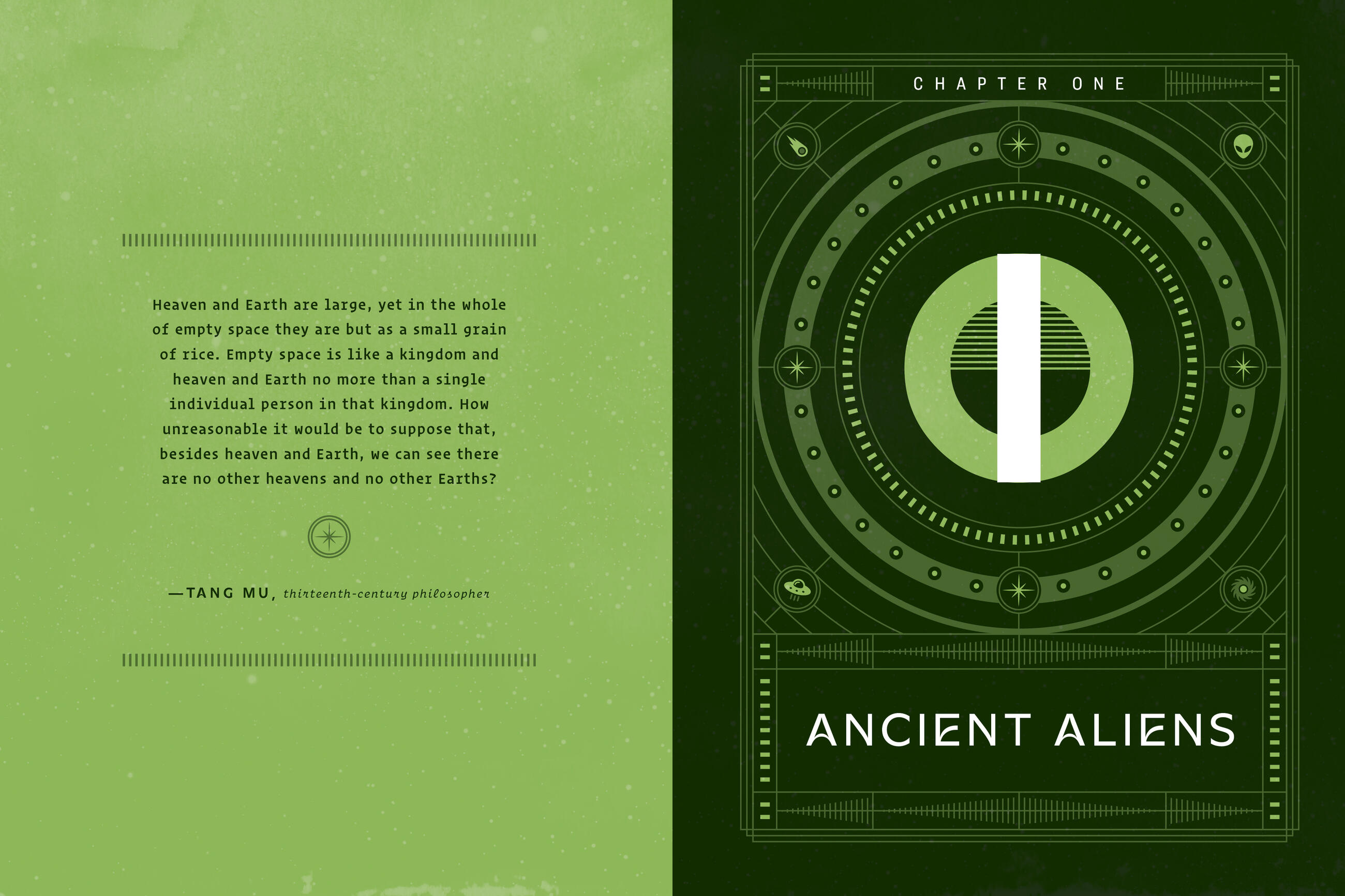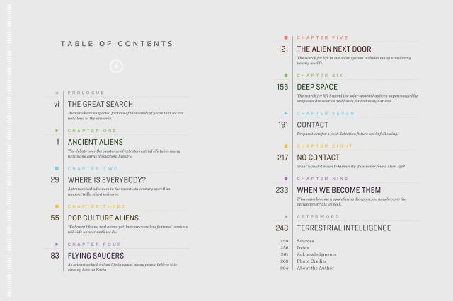 Each chapter is filled with bite-sized explainers and longer sections on meatier topics such as habitable zones, xenolinguistics, and UFO religions. Smaller topics include alien abductions, ancient astronauts, exodinosaurs, Project Cyclops, and the Great Moon Hoax.
