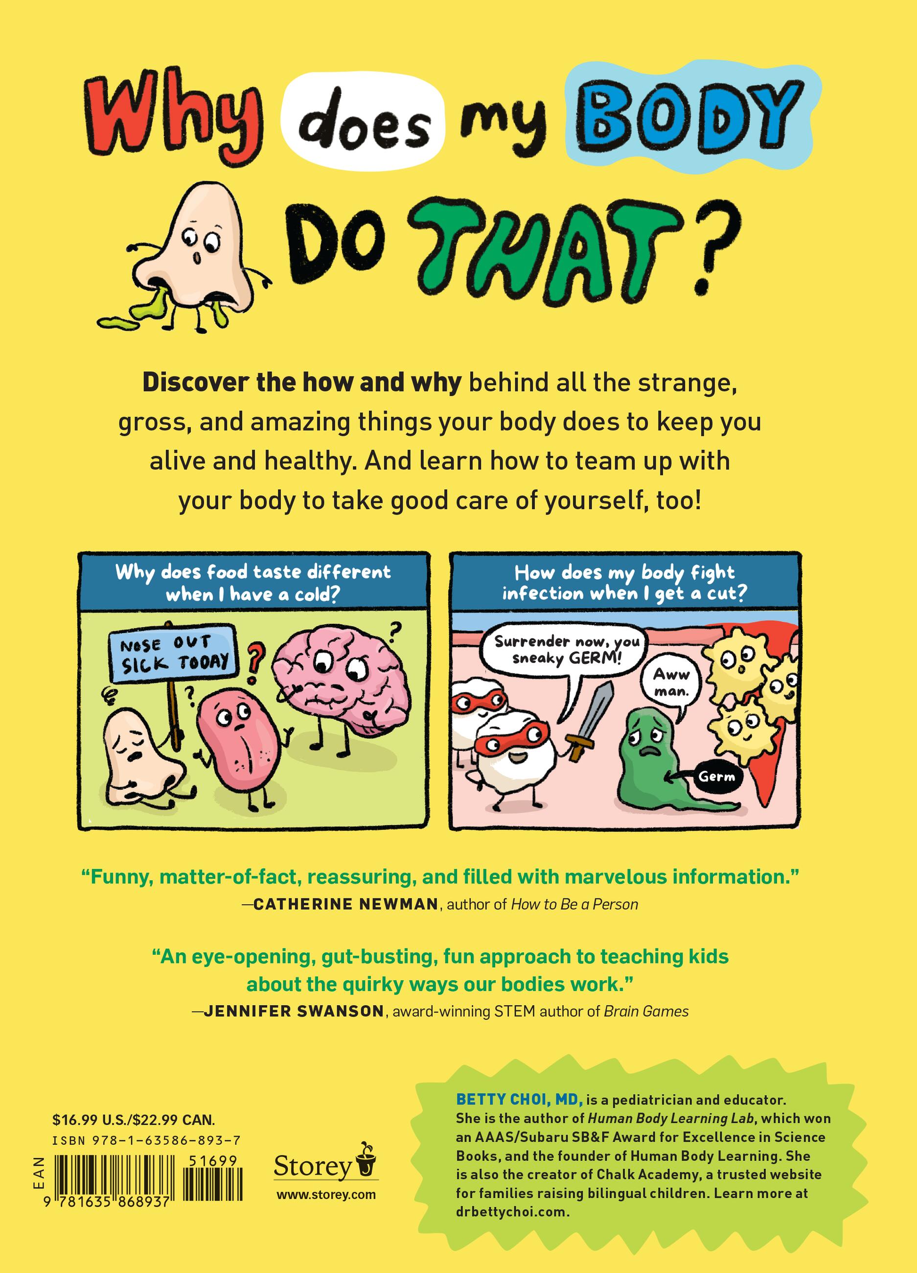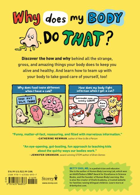 “As a practicing pediatrician, I'm very familiar with the quirky questions children ask during office visits. And while I have not been asked every question in Dr. Choi’s marvelous new book, I've heard most of them. Kids LOVE to learn about the human body, and one of the best ways to teach them is to package the information in small, digestible bites filled with humor. Dr. Choi’s book accomplishes this with the perfect blend of facts and eye-catching illustrations. I can't wait to share it with my own patients!”Howard Bennett, MD, author of The Fantastic Body: What Makes You Tick & How You Get Sick