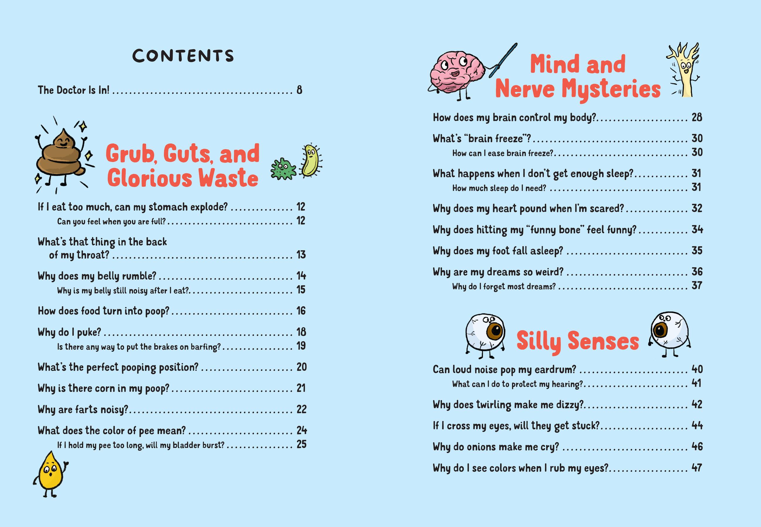 "This book is a fabulous and funny introduction to various bodily functions for curious kids. I’m impressed with how pediatrician Dr. Betty Choi breaks down medical terms into easy-to-understand language while expertly addressing questions children want answers to. The text and art are a hilarious pairing, with bodily humor that will keep kids engaged and laughing. The characters are full of personality, from a drop of urine that is happy to go “into the potty pond” to platelets summoning healing power. What do booger colors mean? Why do my fingers look like raisins after a bath? Find the answers to these and many more questions in this book. Highly recommend!"Dow Phumiruk, MD, pediatrician, author, and illustrator