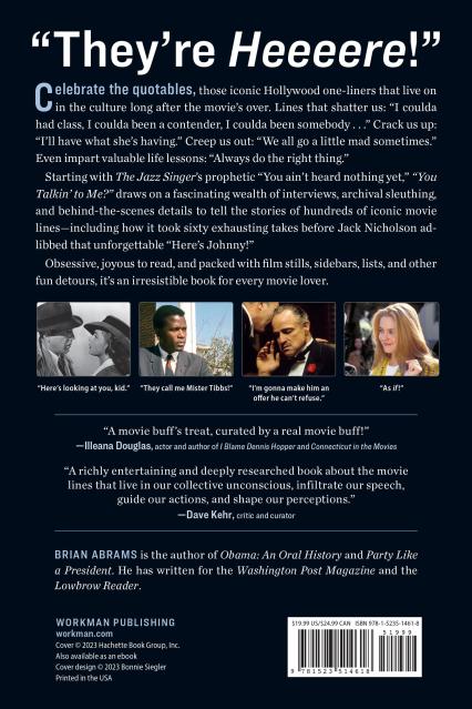 “You Talkin’ to Me?” is a fun, fascinating, and exhaustively reported look at all the iconic Hollywood movie quotes we know and love, from Casablanca to Dirty Harry and The Godfather to Mean Girls. Drawing on interviews, archival sleuthing, and behind-the-scenes details, the book examines the origins and deeper meanings of hundreds of film lines: how they’ve impacted, shaped, and reverberated through the culture, defined eras in Hollywood, and become cemented in the modern lexicon. Packed with film stills, sidebars, lists, and other fun detours throughout movie history, the book covers all genres and a diverse range of directors, writers, and audiences.