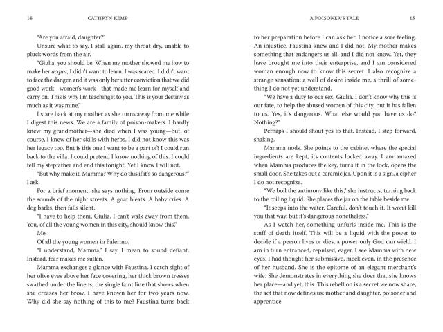 Palermo 1632: Giulia is thirteen when she learns her mother greatest secret: Teofania makes an undetectable, slow-acting, lethal poison—Acqua Tofana—which she uses to free the broken and abused women of Palermo. Now Teofania wants to pass her recipe on to her daughter, and Giulia soon realizes that in a time when women have no voice, justice is sometimes best served in a cup of wine or broth.