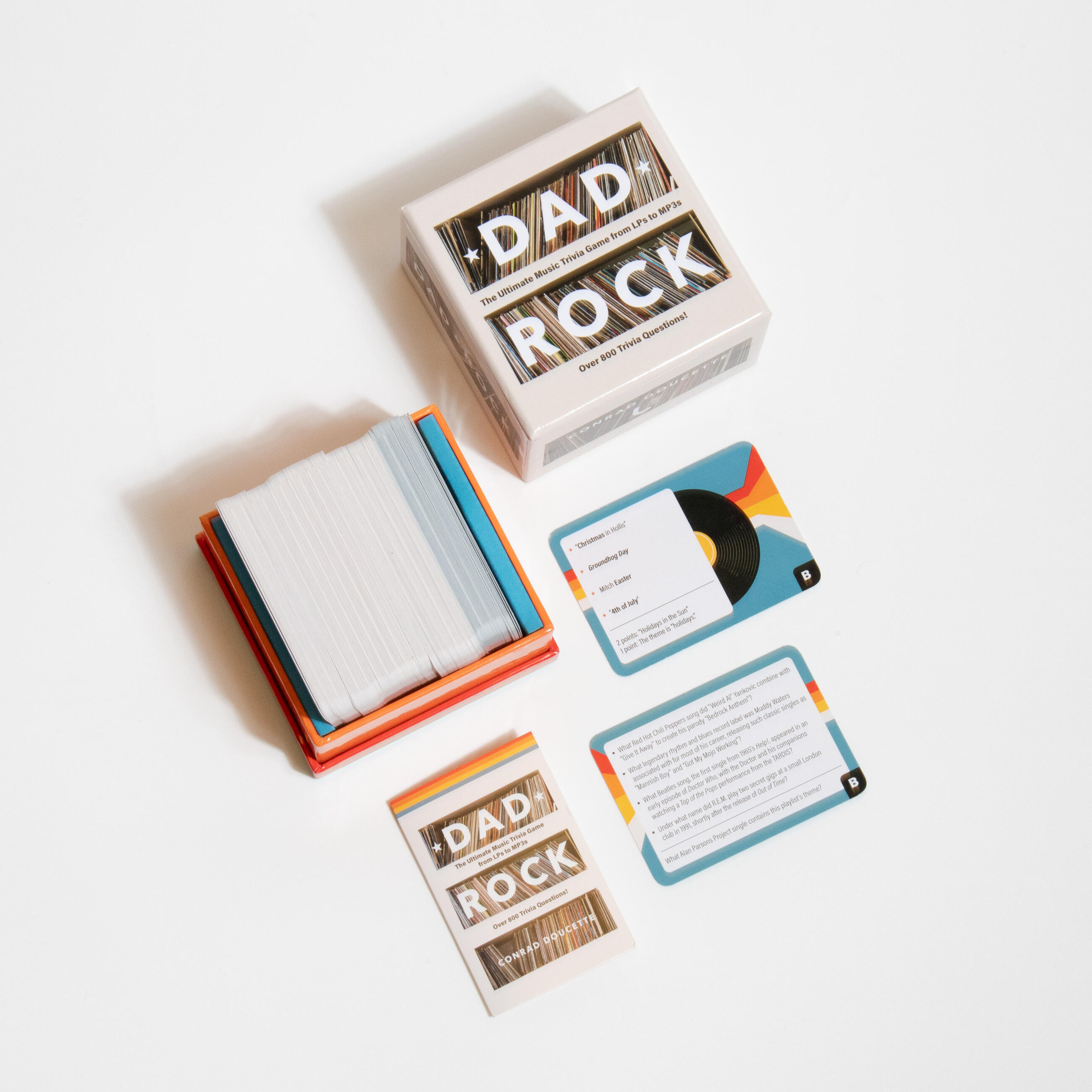In each round of Dad Rock, players can choose to answer “A-Side” questions for one point, or, if they’re feeling adventurous, try a “B-Side” quiz featuring multiple trivia questions (the “playlist”) that have something in common (the “algorithm”), earning additional points for each correct answer, plus bonus points for guessing the algorithm. The more answers they know, the more clues they’ll have for figuring out the connection—and if they figure it out early, they’ll have extra help with the remaining answers.