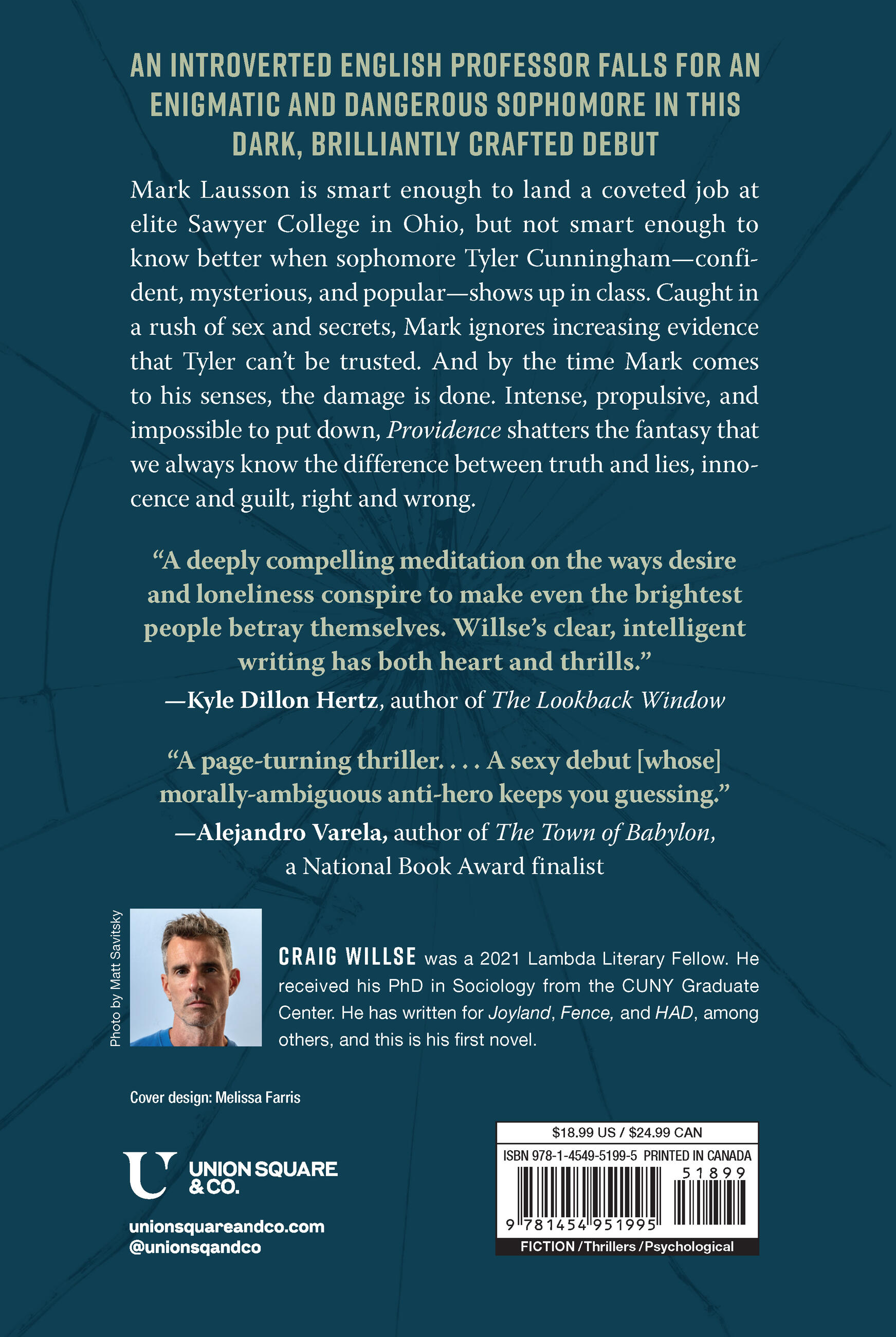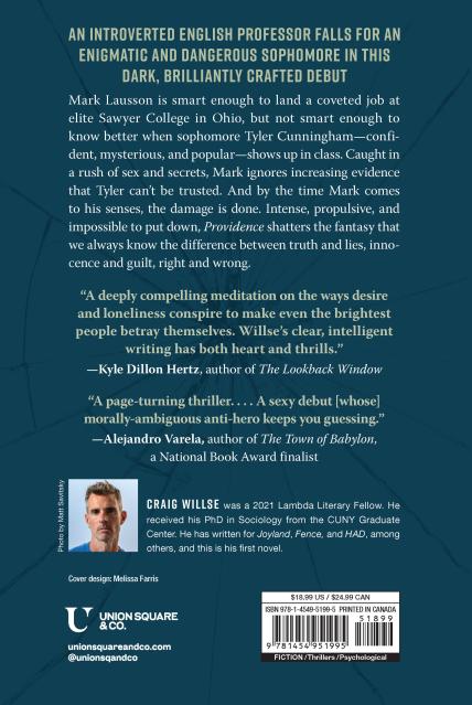 Mark Lausson has everything he thought he wanted: a coveted job at elite Sawyer College in Ohio. But at the start of his second year, stuck in a small town with deadlines piling up and paychecks falling short, Mark can already feel the fantasy crumbling. And then, a few weeks in, sophomore Tyler Cunningham shows up in class. In Tyler—confident, mysterious, and popular—Mark glimpses another way of being in the world. He finds Tyler’s self-possession both compelling and unsettling. Caught in the rush of sex and secrets, Mark ignores the increasing evidence that Tyler can’t be trusted. But by the time Mark comes to his senses, the irreparable damage is done. Complicating easy ideas of innocence, Providence explores the ways loneliness and desire distort our senses of self and other, right and wrong.
