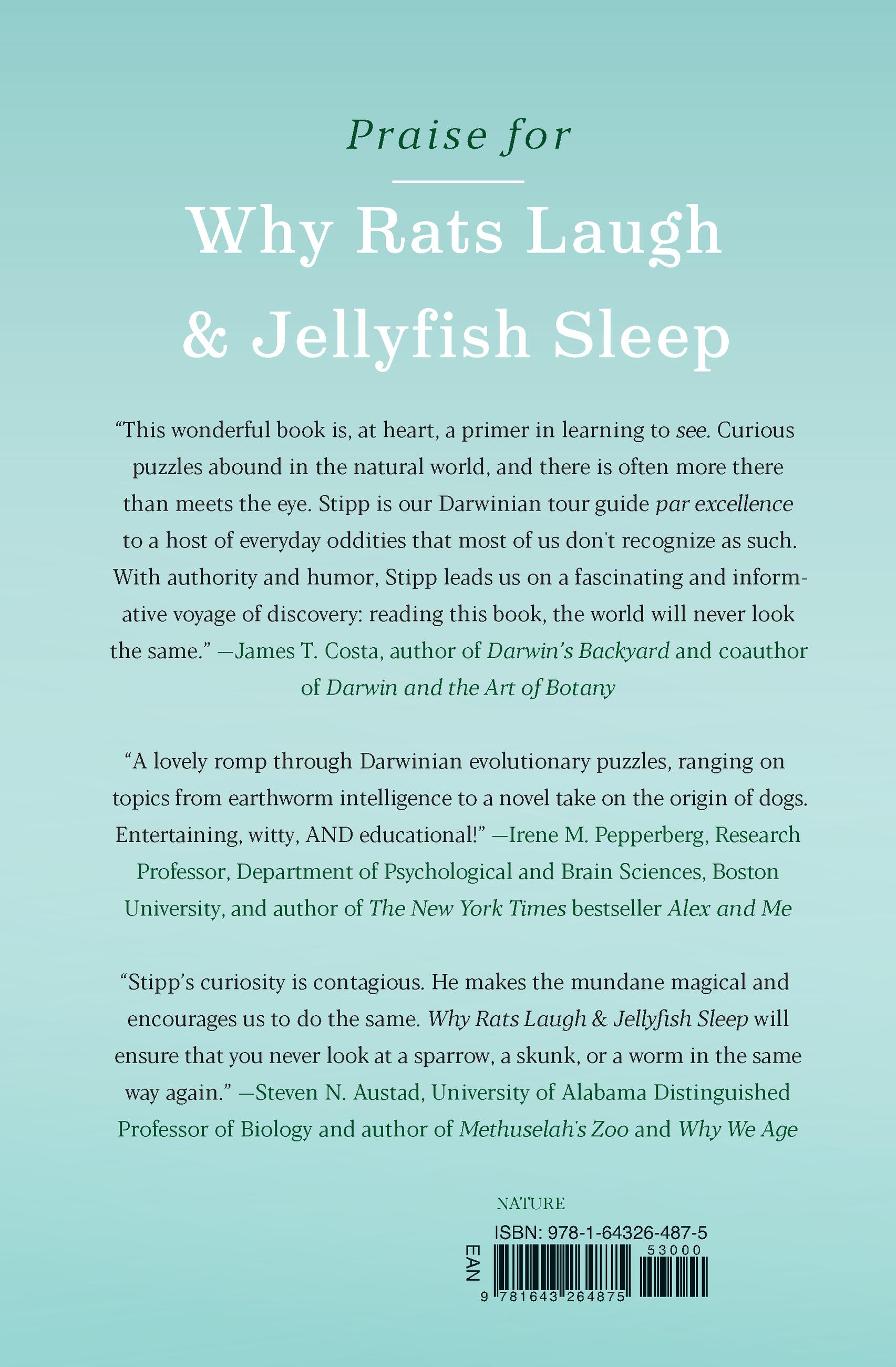 "Stipp’s curiosity is contagious. He makes the mundane magical and encourages us to do the same. Why Rats Laugh and Jellyfish Sleep will ensure that you never look at a sparrow, a skunk, or a worm in the same way again."Steven N. Austad, University of Alabama distinguished professor of biology and author of Methuselah's Zoo and Why We Age