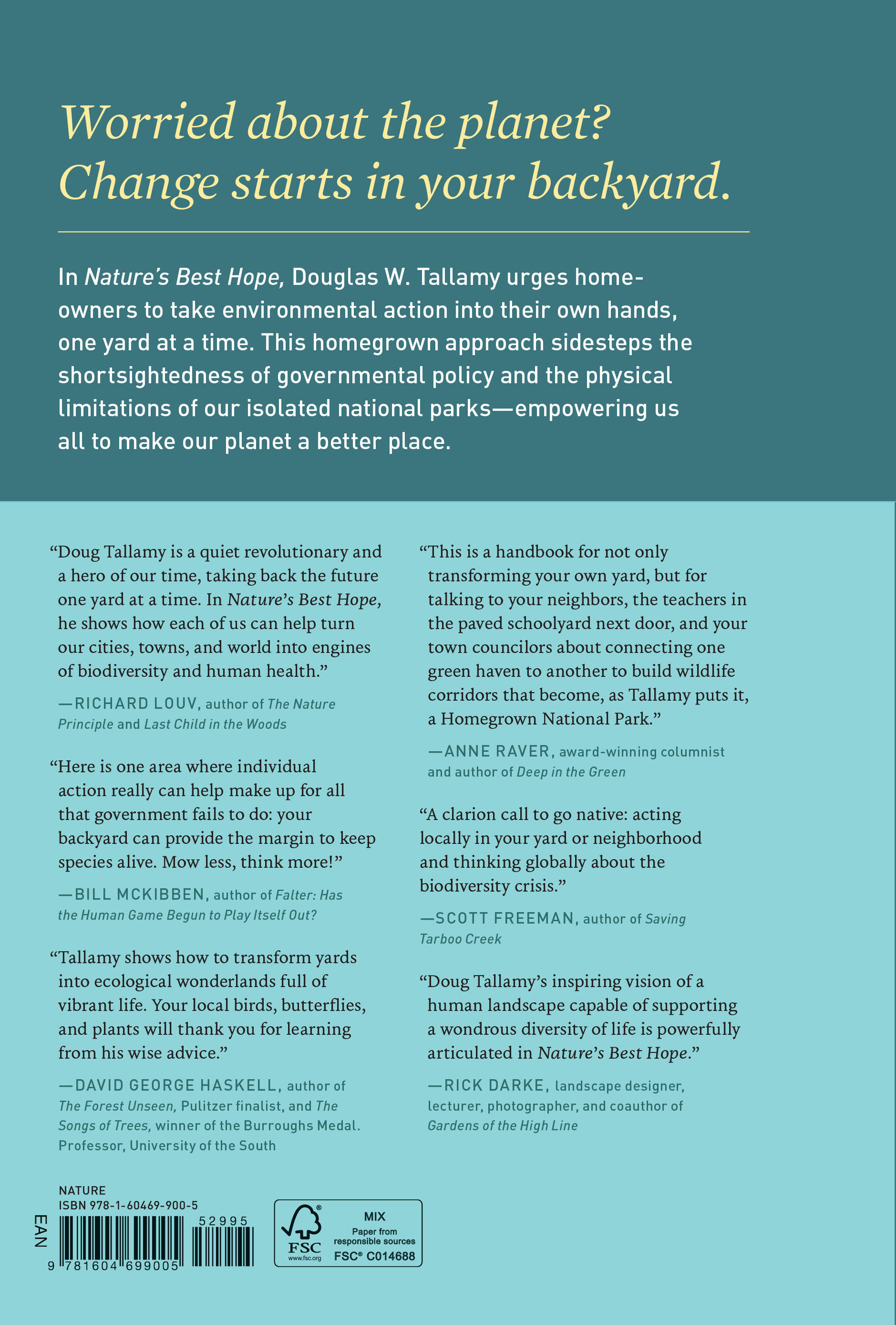 “Doug Tallamy is a quiet revolutionary and a hero of our time, taking back the future one yard at a time. In Nature’s Best Hope, he shows how each of us can help turn our cities, towns and world into engines of biodiversity and human health.”B>Richard Louv, author of Last Child in the Woods and Our Wild Calling