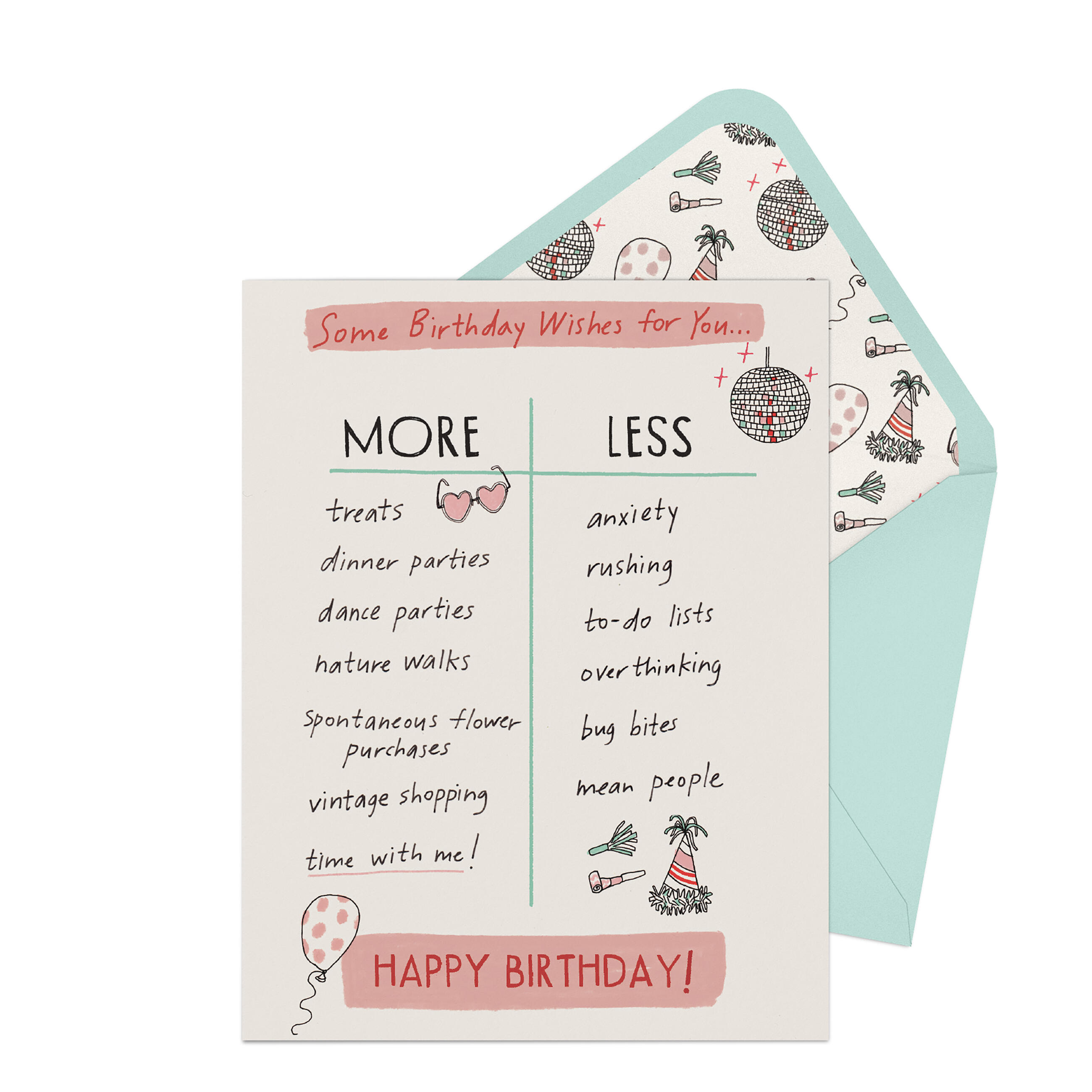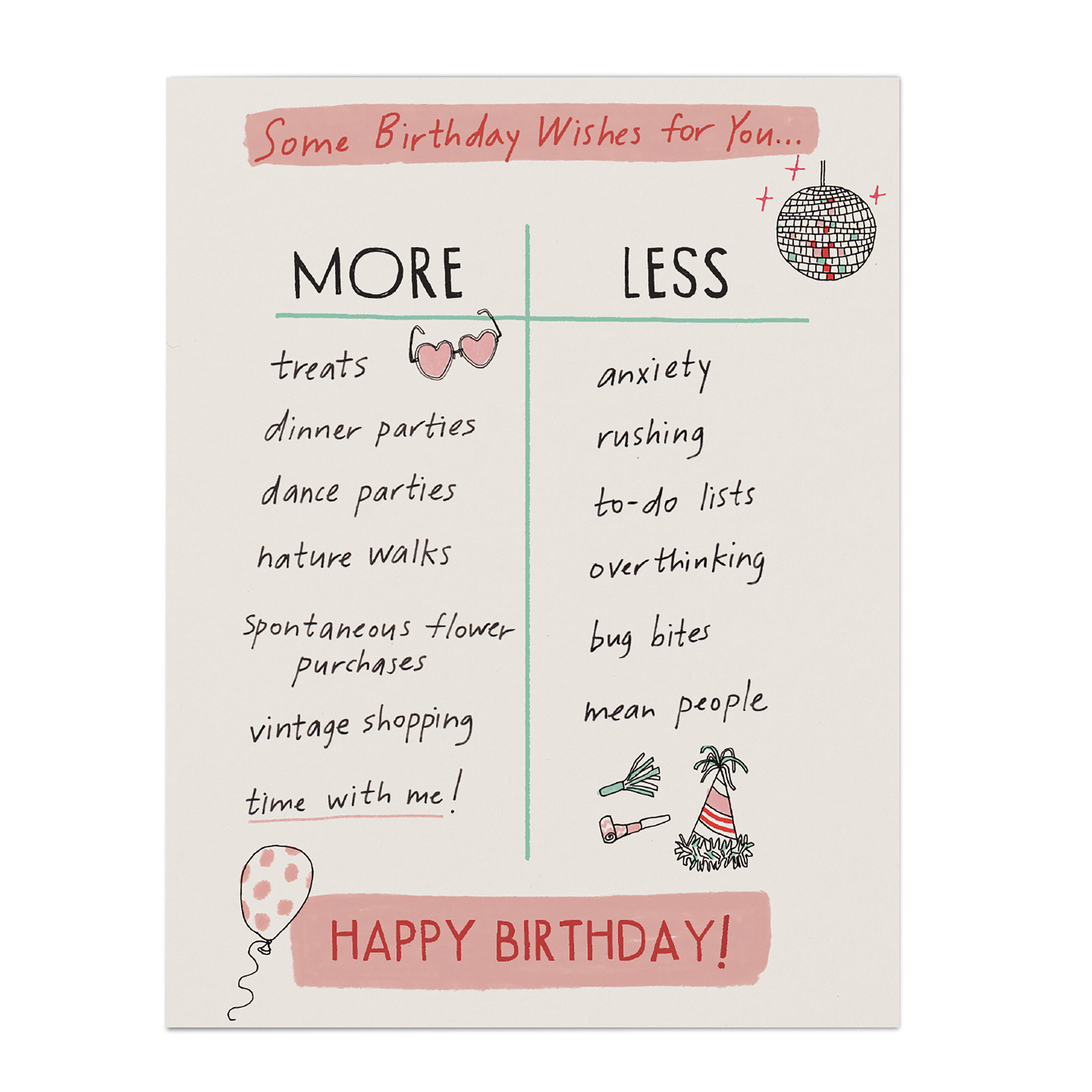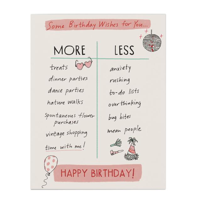 Did you know that every single day of the year is someone’s birthday? Did you know that it’s been (un)scientifically proven that people keep the birthday cards they receive forever and ever? That’s why it’s important to give the best people the best birthday cards, and this new card from author and illustrator Julia Rothman is one of the very best of the very, very best. Who doesn’t want someone wishing them MORE dance parties, nature walks, and vintage shopping and LESS anxiety, overthinking, and bug bites? NO ONE — that’s who.