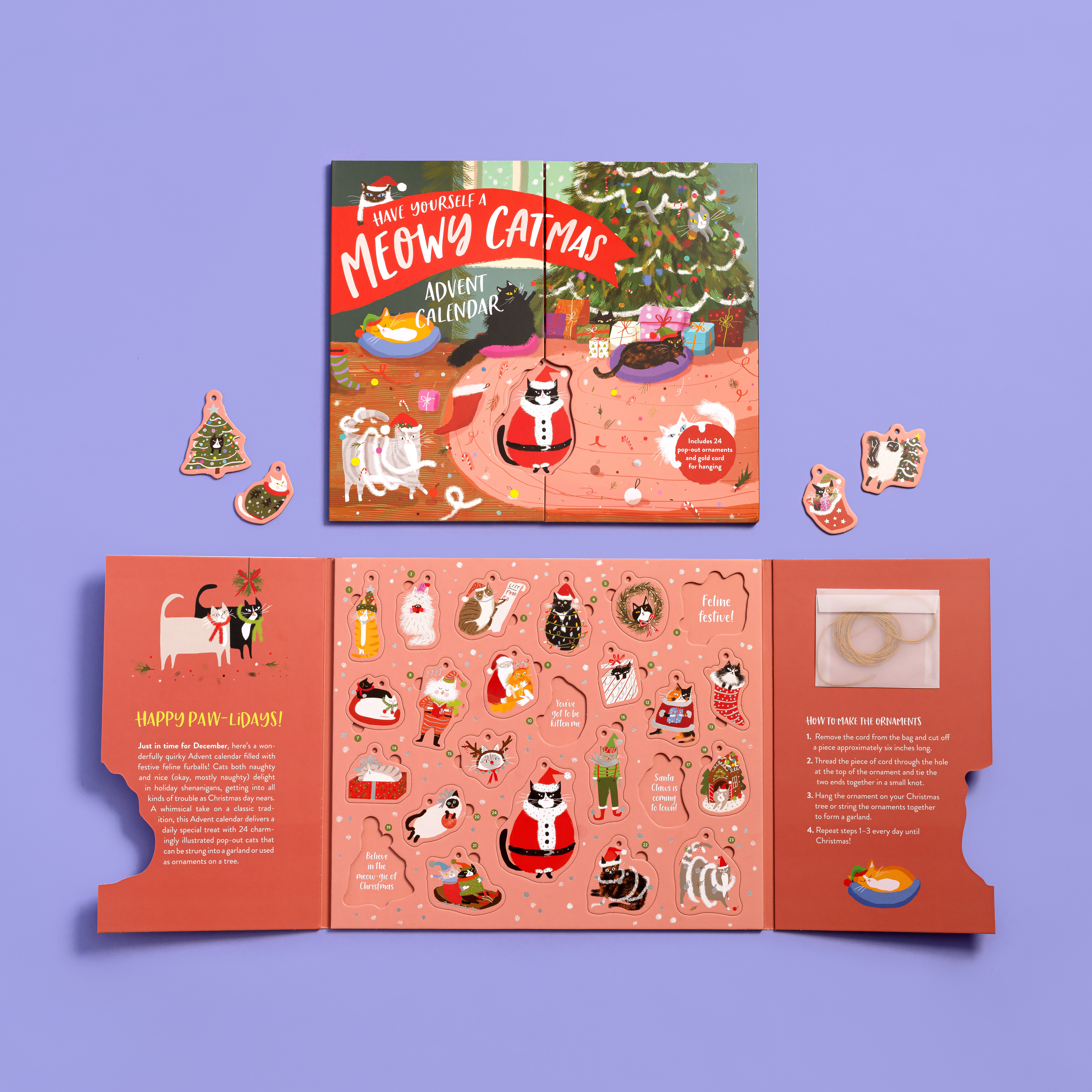 Join all the cool cats this holiday season! A little cute, a little cheeky, and packed with personality—just like the cats we know and love—this Advent calendar celebrates the countdown to Christmas in pure feline style. Illustrated by artist Jamie Shelman, it features 24 adorable pop-out cat ornaments and, underneath each, punny captions to make sure you don’t lose sight of the fun of it all. Deck the halls with balls of yarn. The snuggle is real. Paw humbug. Pure catnip.