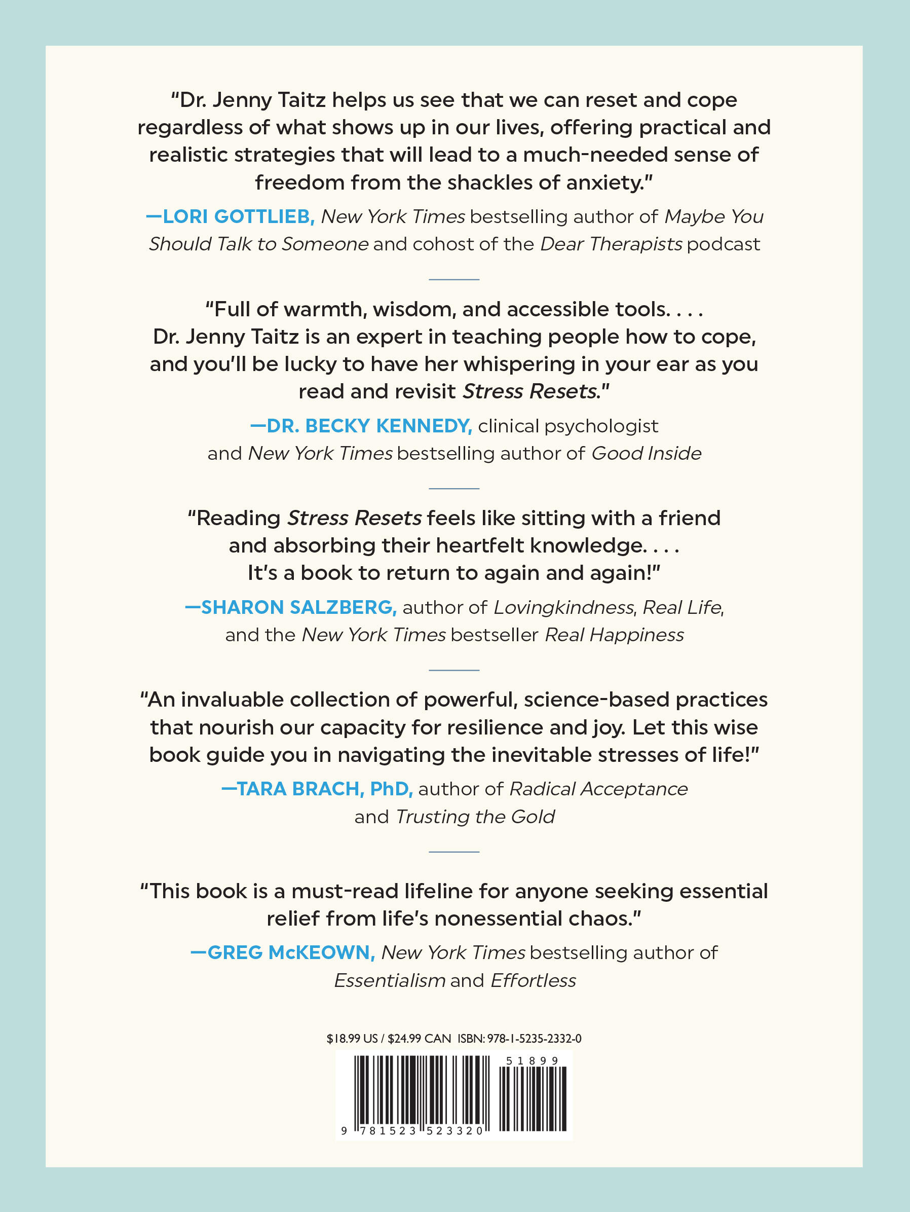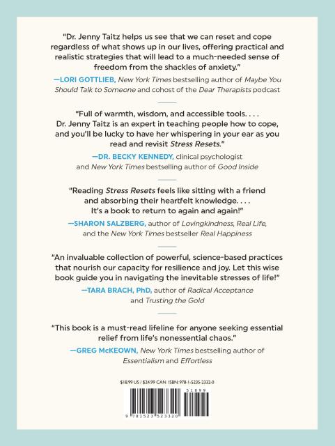 “This is one of the most practical self-help books—full of warmth, wisdom, and accessible tools so you know what to do to improve this moment and build a life that feels bigger. Dr. Jenny Taitz is an expert in teaching people how to cope and you’ll be lucky to have her whispering in your ear as you read and revisit Stress Resets.”Dr. Becky Kennedy, clinical psychologist and New York Times bestselling author of Good Inside