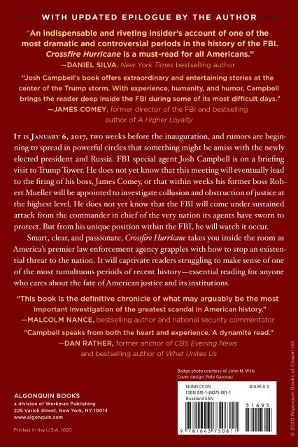 Juliette Kayyem, former Assistant Secretary, Department of Homeland Security “With no political agenda other than reverence for the FBI as an institution, Campbell offers a compelling and unvarnished portrait of men and women struggling to deliver impartial justice in the middle of a relentless wave of political firestorms.”—Michael Isikoff, bestselling co-author of Russian Roulette and Yahoo! News chief investigative correspondent “An indispensable and riveting insider’s account of one of the most dramatic and controversial periods in the history of the FBI. Crossfire Hurricane is a must-read for all Americans.” —Daniel Silva, New York Times bestselling author   “I couldn't put down Crossfire Hurricane: Inside Donald Trump's War on the FBI. The book provides a compelling overview of events surrounding the FBI during the 2016 election and its aftermath. Even for those of us who are still living through this in real time, it's stunning to read a cohesive narrative of the events—often with shocking details from an FBI insider's perspective. Just as important, Josh uses anecdotes throughout the book that capture the essence of what it means to be an FBI agent in the field working every day to help keep this country safe—something that is all too often lost in the day-to-day headlines these days.”—Mimi Rocah, NBC/MSNBC legal analyst and former federal prosecutor