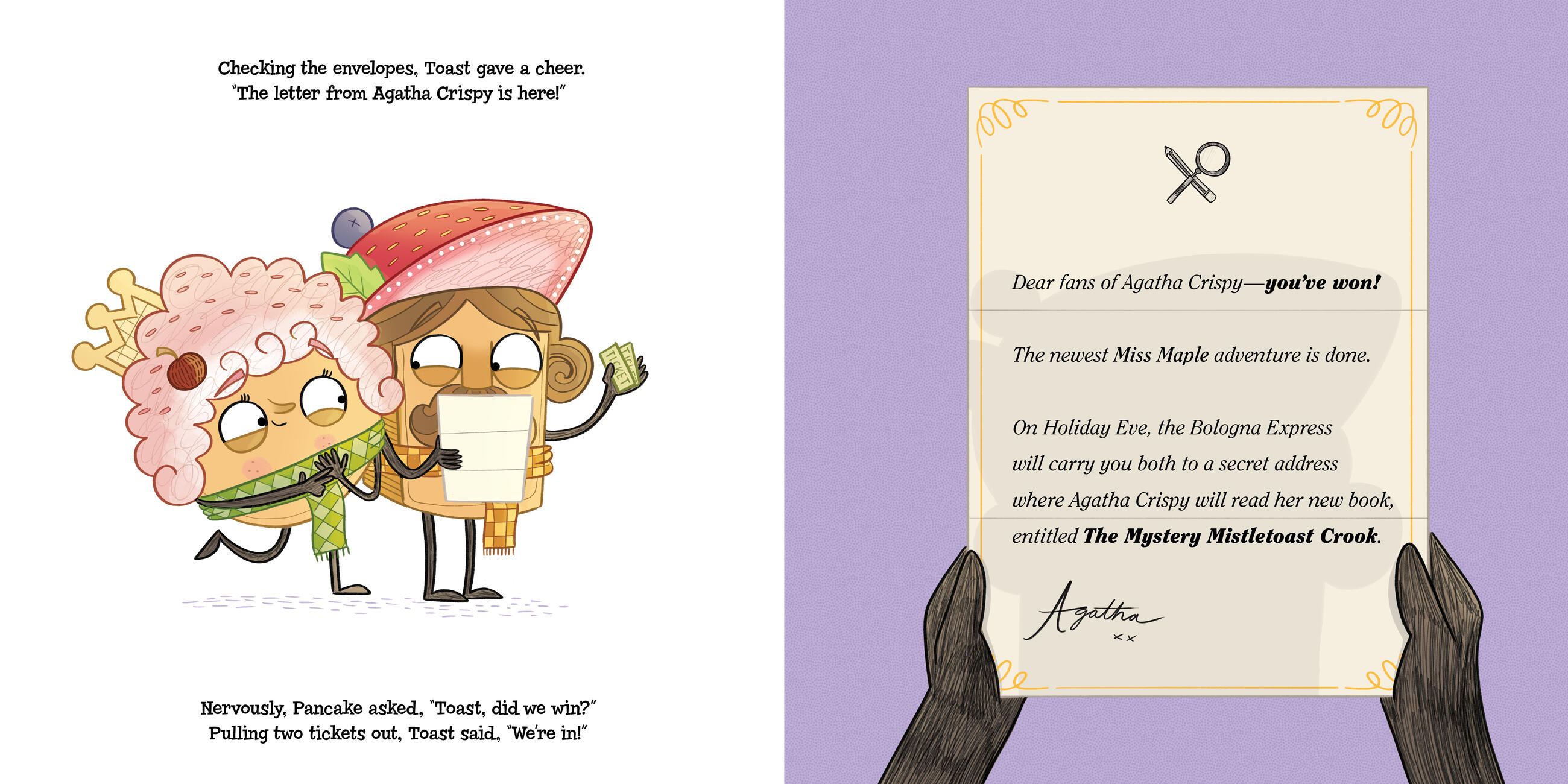 The day has come for the unveiling of the newest Miss Maple book, and Lady Pancake and Sir French Toast have been invited to the very first reading on Holiday Eve! Around the room, everyone is filled with excitement and holiday cheer as they wait for Agatha Crispy to open the book to the first page.