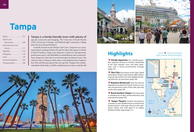 - Top activities and unique experiences: Discover the vibrant performing arts scene in Sarasota or stroll through quaint riverfront towns and secluded island enclaves. Unwind on shell-scattered beaches or spot gators in the swampy Everglades. Ride the coasters at Busch Gardens, browse art galleries in Naples, or catch a college baseball game during Spring Training. Sail through the canals of Tampa, kick back at a beachfront oyster bar, and sip a local brew as the sun sets over the ocean
