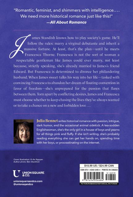 James Standish knows how to play society’s game. He’ll follow the rules—marry a virginal debutante and inherit a massive fortune. At least, that’s the plan until he meets Francesca Thorne. She’s not the sort of woman a respectable gentleman like James could ever marry—not least because, strictly speaking, she’s married already to James’s friend Edward. Francesca is determined to flout convention and divorce her philandering husband. When James sweet-talks his way into her life—tasked with convincing Francesca to abandon her dream of freedom—she’s unprepared for the passion that flares between them.