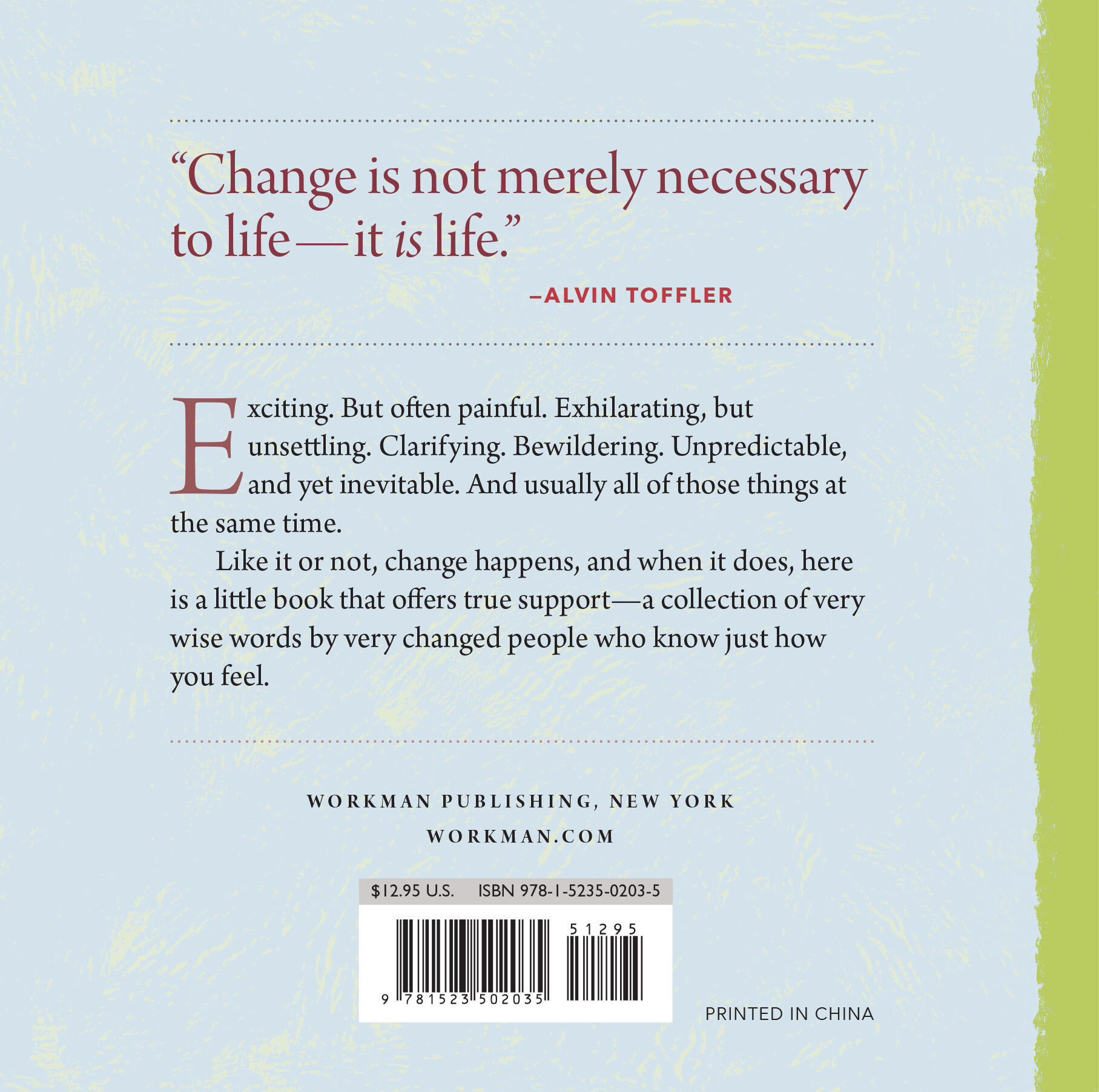 Exciting. But often painful. Exhilarating, but unsettling. Clarifying. Bewildering. Unpredictable, and yet inevitable. And usually all of those things at the same time. Like it or not, change happens, and when it does, here is a little book that offers true support—a collection of very wise words by very changed people who know just how you feel.
