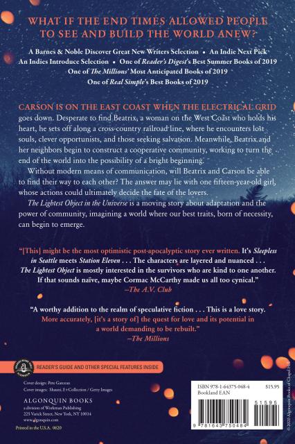 “A compellingly realistic depiction of the world after the collapse of civilization, although at its heart, it is a love story told in the vein of Cold Mountain . . . The Lightest Object in the Universe is an intriguing and engrossing debut novel that will leave readers thinking about their own ability to survive, their own capacity for love, and their willingness to face catastrophe with hope.”