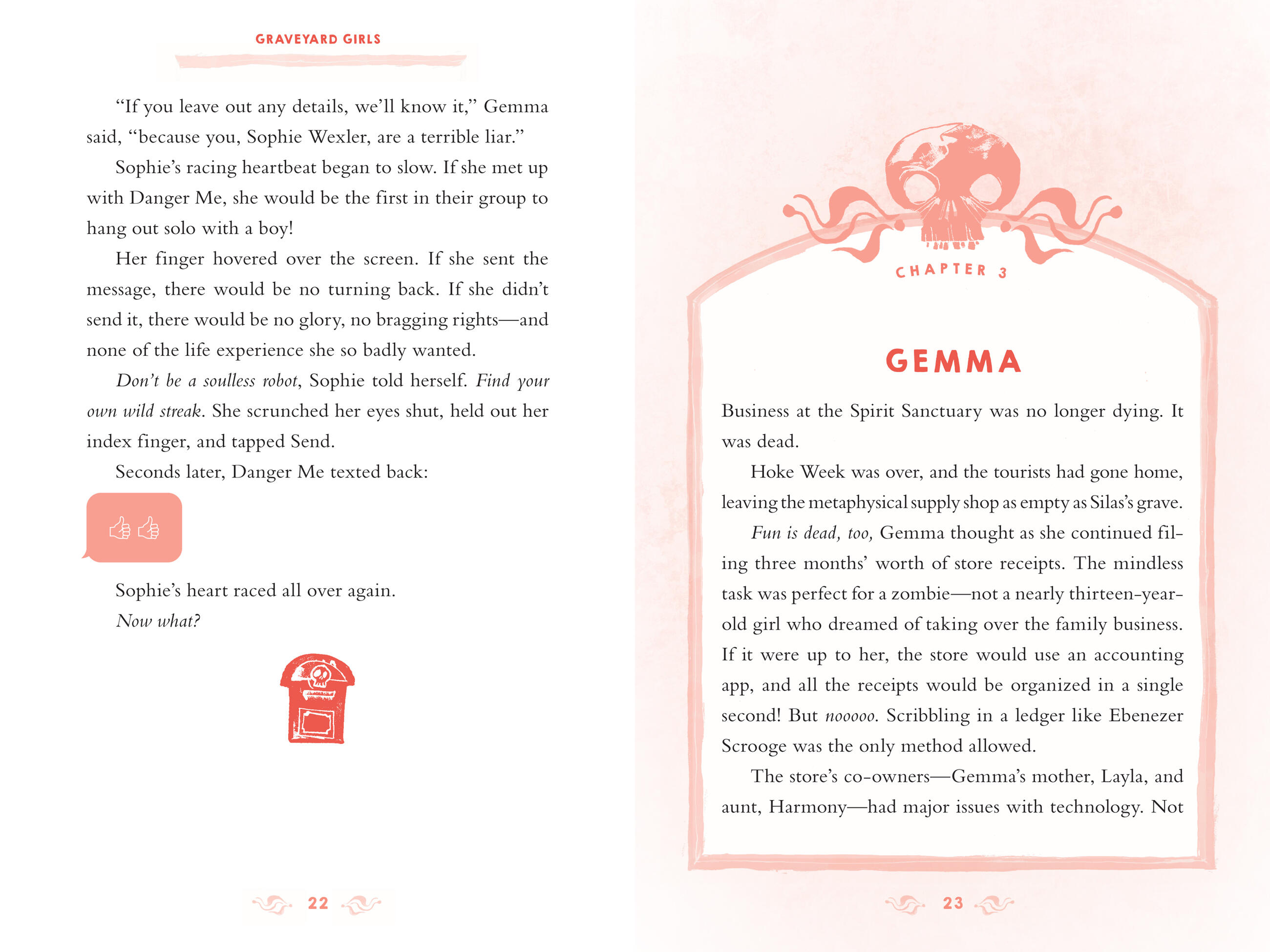 Speaking of bad news, straight-A Sophie is quickly sliding down the scale to becoming a B-flat friend. She is spending way more time hanging out with “Danger Me” and way less time with the Graveyard Girls and her schoolwork. Will her scary story be enough to win back her pals, or will her picture-perfect life become the ultimate photo bomb?