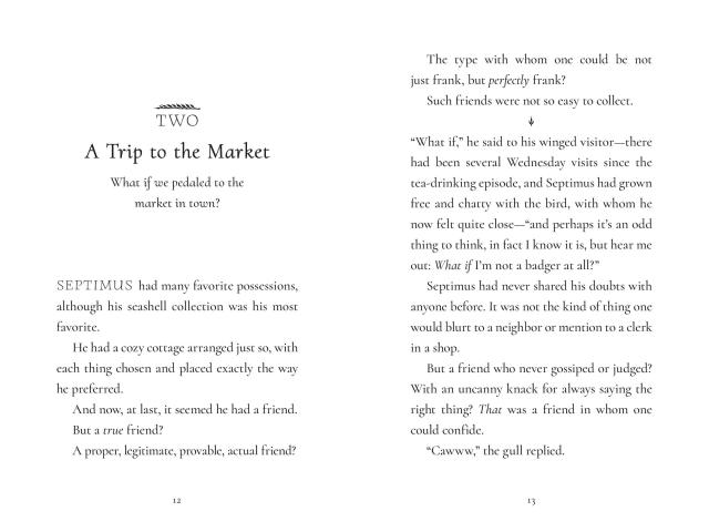 When a gull of very few words lands on the windowsill, Septimus leaps at the possibility of friendship. However, his new confidant soon goes missing and Septimus is bereft. Determined to find his best—and only—friend, he ventures into new territory and encounters a cast of surprising characters. Can Septimus be as brave and bighearted as he’ll need to be to find Gully? Or is he really a bad badger after all?