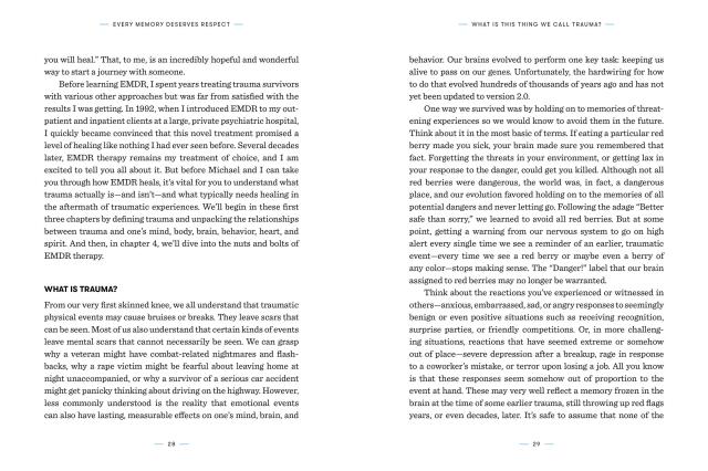 Through compelling science, personal stories, and powerful photographic images, we learn how trauma is stored in the brain and body, continuing to cause pain and suffering, and how EMDR frees us by repatterning our thinking and emotional reactions. It explains why talk therapy has only a limited impact on trauma recovery, describes what to expect from gentle and targeted EMDR therapy, and offers guidance on how to find a therapist who is just right for you.