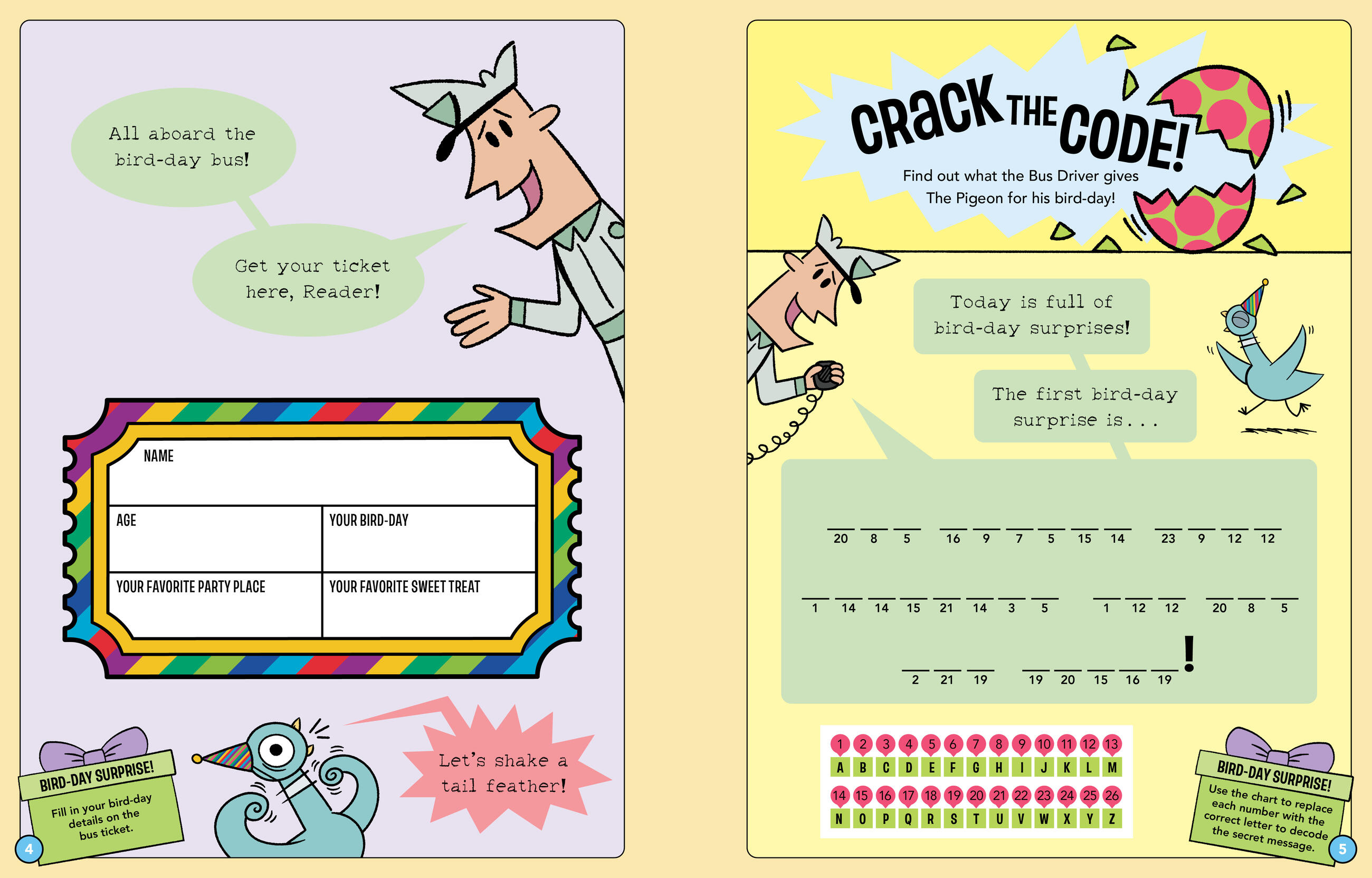 Join The Pigeon, Duckling, and the chicks for a bird-day like no other. From playing games to cake-decorating, there is so much to do—and only one day to do it all! Can The Pigeon and pals squeeze every bit of bird-day fun into one amazing day!?!