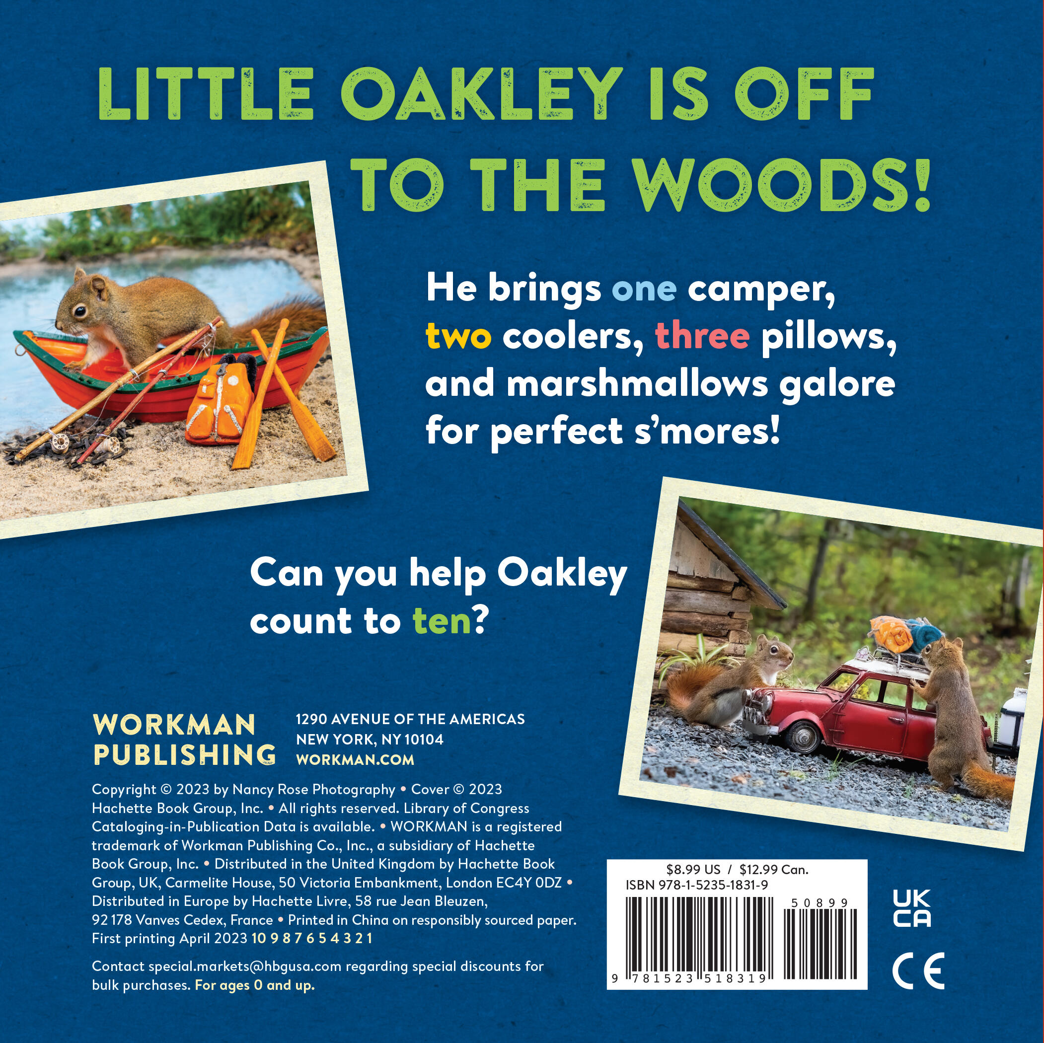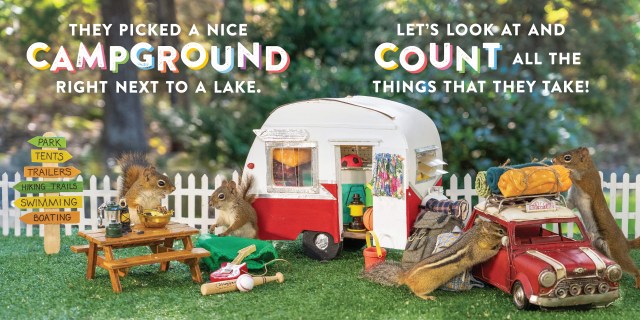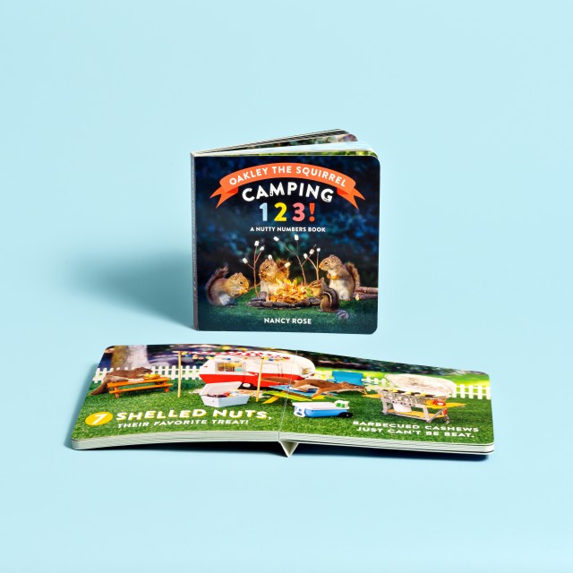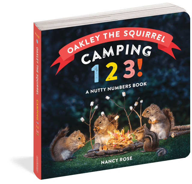 Oakley the Squirrel: Camping 1, 2, 3! is a counting book like no other. Oakley helps readers learn to count as he experiences the fun of a camping trip. Every page features photos of real squirrels! Photographer Nancy Rose lures squirrels into her photo frame using strategically placed peanuts, so they appear in squirrel-sized sets that replicate human life, complete with tents, s’mores, campfires, and more. It’s irresistible!