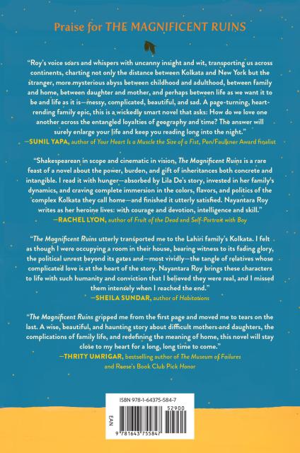 "Shakespearean in scope and cinematic in vision, The Magnificent Ruins is a rare feast of a novel about the power, burden, and gift of inheritances both concrete and intangible. I read it with hunger—absorbed by Lila De's story, invested in her family's dynamics, and craving complete immersion in the colors, flavors, and politics of the complex Kolkata they call home—and finished it utterly satisfied. Nayantara Roy writes as her heroine lives: with courage and devotion, intelligence and skill."Rachel Lyon, author of Fruit of the Dead and Self-Portrait with Boy
