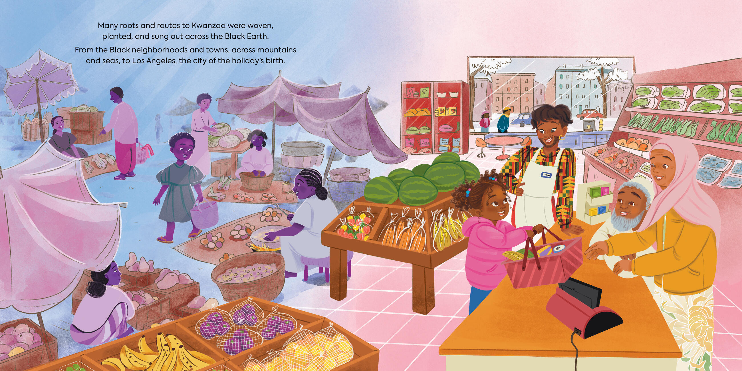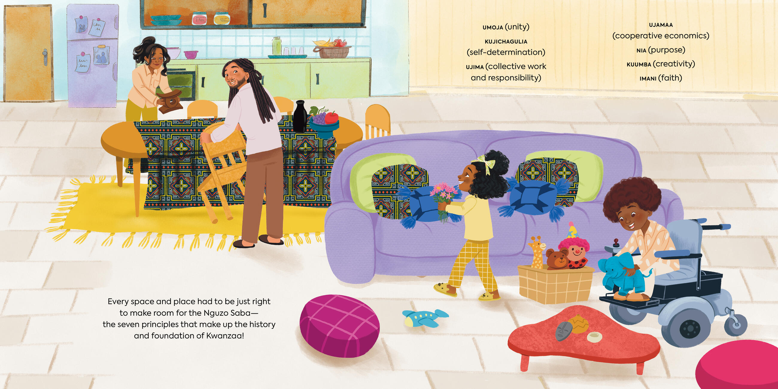 • "This celebration of Kwanzaa explores the seven defining principles of the annual observation…vibrant, detailed, and busy illustrations show a multiethnic and variously abled cast of characters enjoying each evening, whether coming together as a community to celebrate the first night of unity at a local farmers’ market or kids and adults sitting around a table happily making crafts in observance of the sixth night, creativity.”