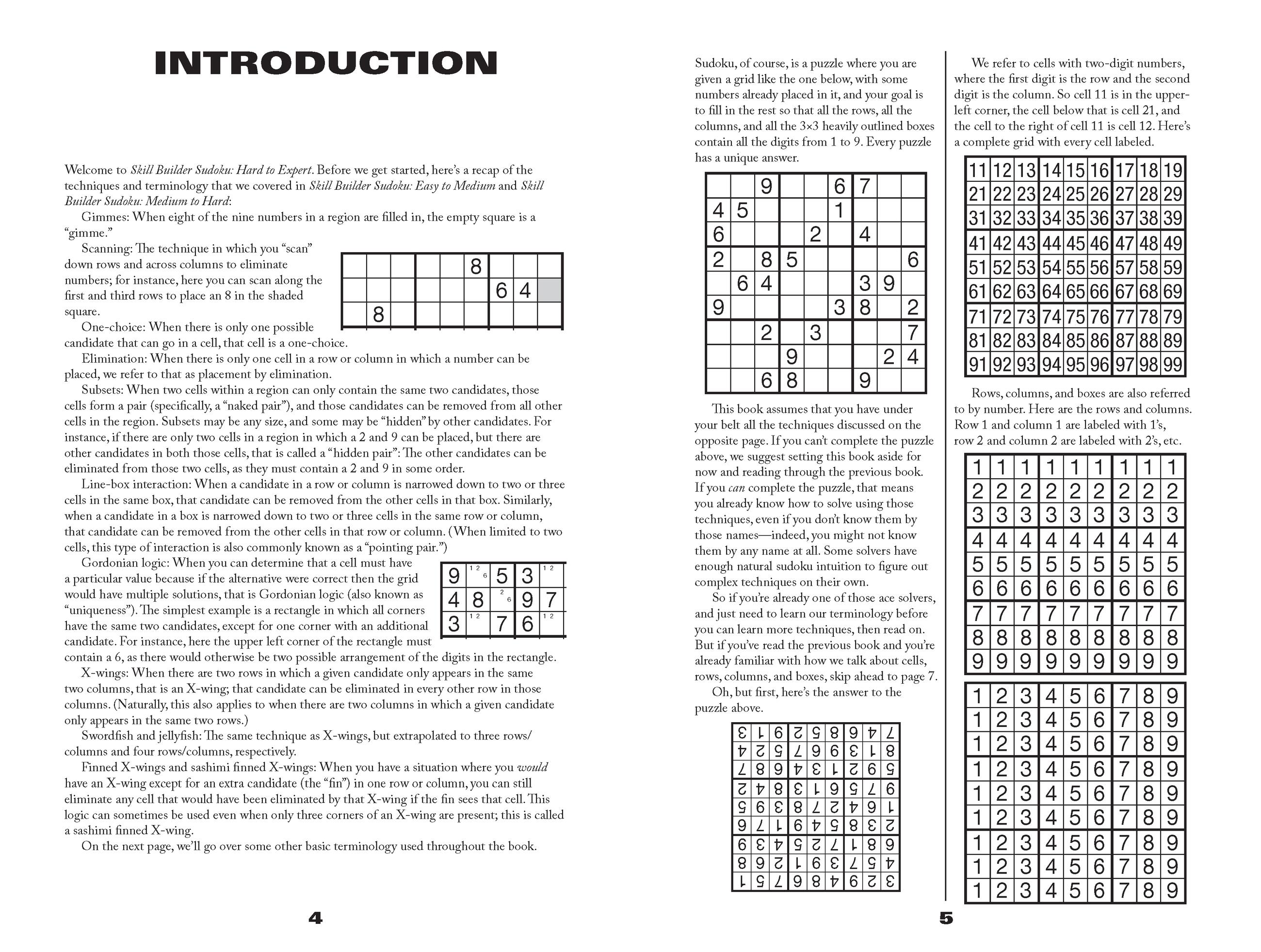 In this three-book series, each book helps solvers build their skills to get from one level to the next. Puzzles in Hard to Expert are the most challenging and will build on the skills learned in the second book, Medium to Hard. Each new technique (such as swordfish and grid coloring) is introduced gradually, giving solvers time to fully master each skill as they progress to complete sudoku mastery.