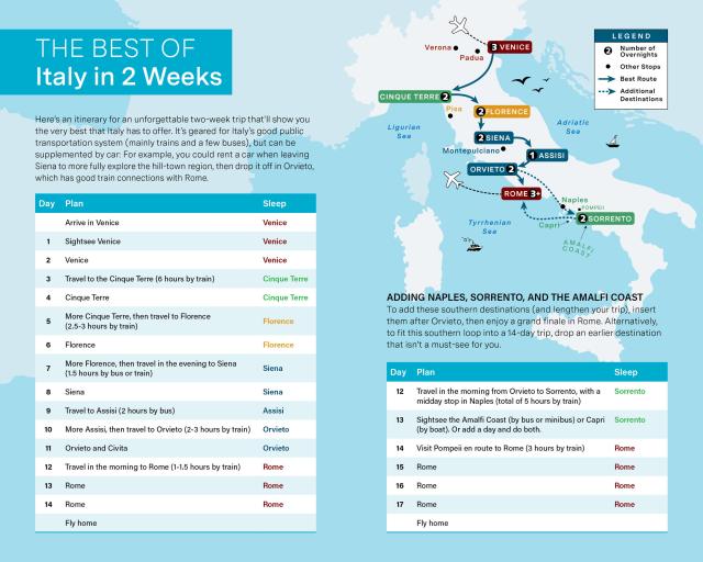 - Two-day itineraries covering Venice, the Cinque Terre, Florence, the Hill Towns of Central Italy, Rome, Naples, Sorrento, and the Amalfi Coast