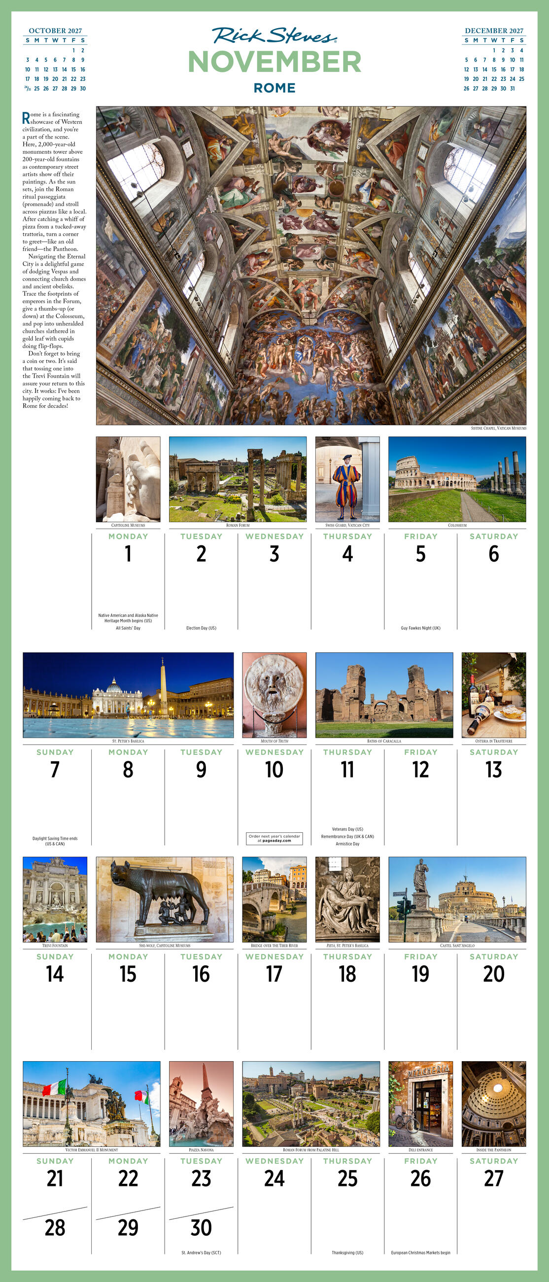 - GREAT GIFT: Ideal for anyone who wishes they could spend all year traveling, this is the ultimate calendar for Europe aficionados. Each month features a bucket-list destination with a map, itinerary, highlights, and over 20 photos throughout the grid.