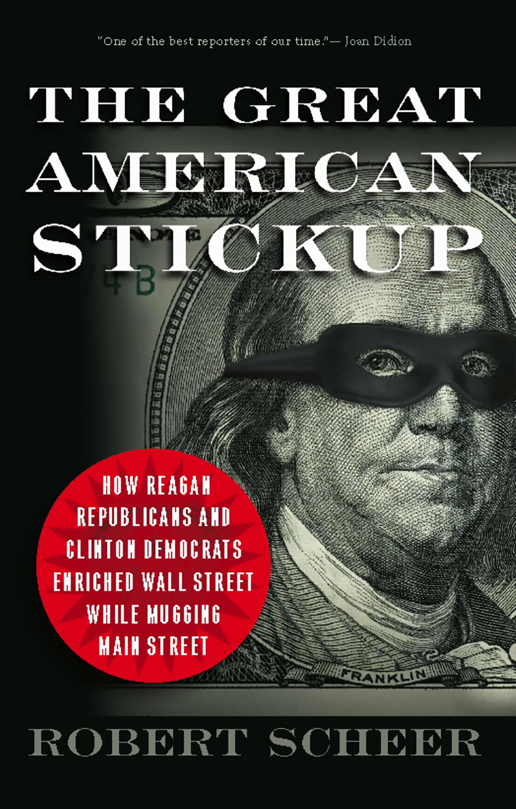 “Robert Scheer is among the vanishing breed of journalists who take it as a patriotic duty to criticize power no matter who wields it. Whatever your views on financial regulation, The Great American Stickup makes nauseatingly clear that both major parties—including the current and former president—colluded with banks ‘and left the rest of us holding the bag”
