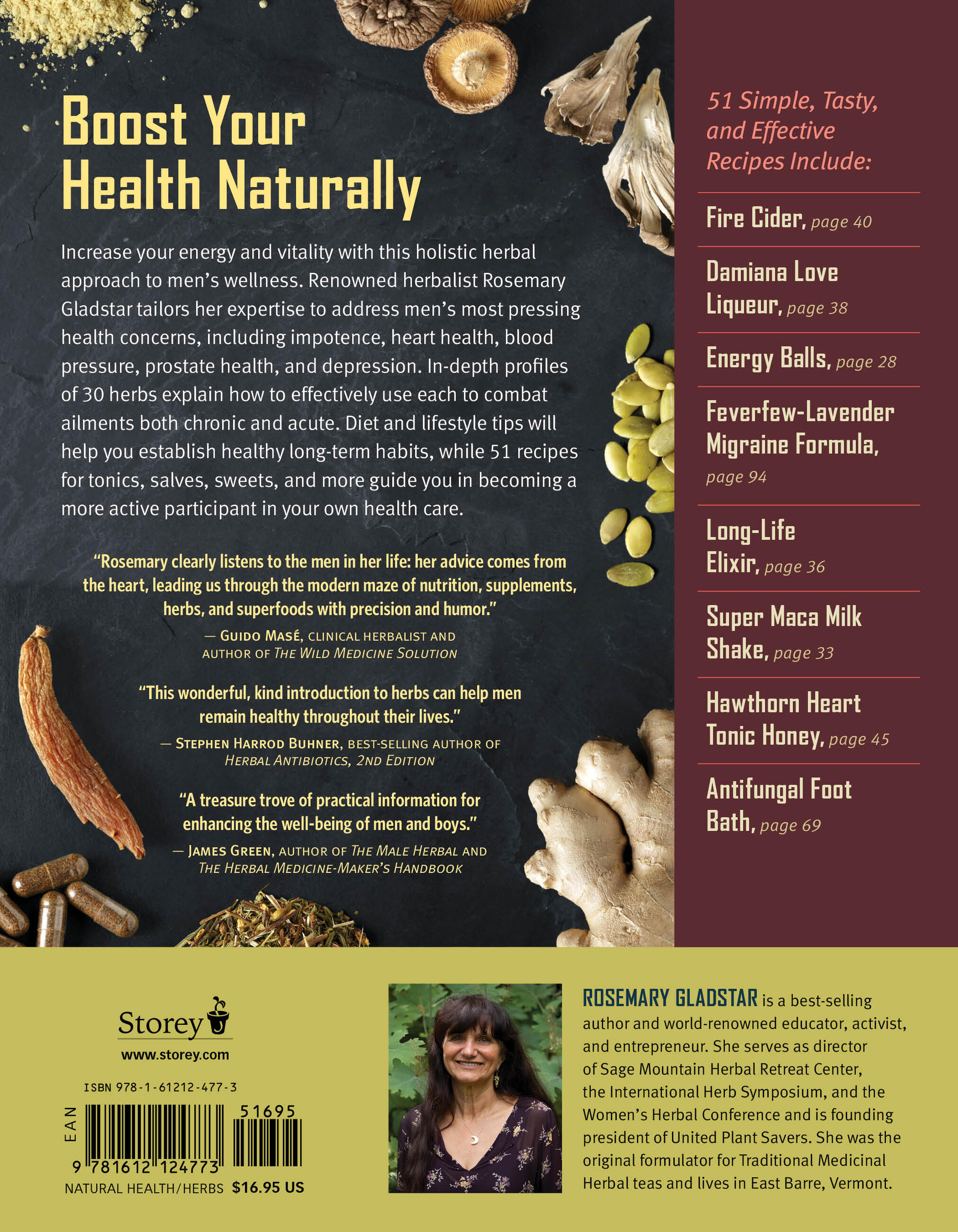 Herbalist Rosemary Gladstar – author of dozens of books, including Herbs for Children’s Health, Herbs for Stress & Anxiety, and Fire Cider! – now offers wellness expertise specifically for men. Dozens of delicious and simple formulas address men’s most common health concerns, including sexual vitality, prostate well-being, stress reduction, and heart health. An A-to-Z compendium of ailments shows you how to treat them effectively using a variety of safe, easy, all-natural remedies. In-depth profiles of 29 herbs explain how men will benefit from each and give clear instructions for preparation and usage.