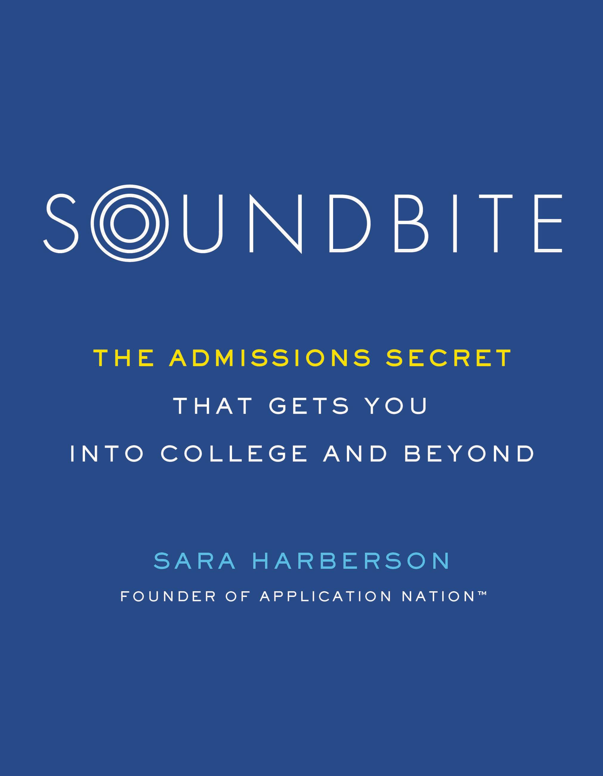 "High school students coping with anxiety and insecurity over college applications will be relieved to know that they have a secret power that differentiates them from everyone else. Soundbite is an immensely readable and practical guide to discovering that secret. Sara Harberson has years of experience helping students from all different backgrounds run the admissions gauntlet. She has distilled her insights into wisdom that applies well beyond the college years: ‘know thyself and know thy strengths.'"Bill McGarvey, author of The Freshman Survival Guide: Soulful Advice for Studying, Socializing, and Everything In Between