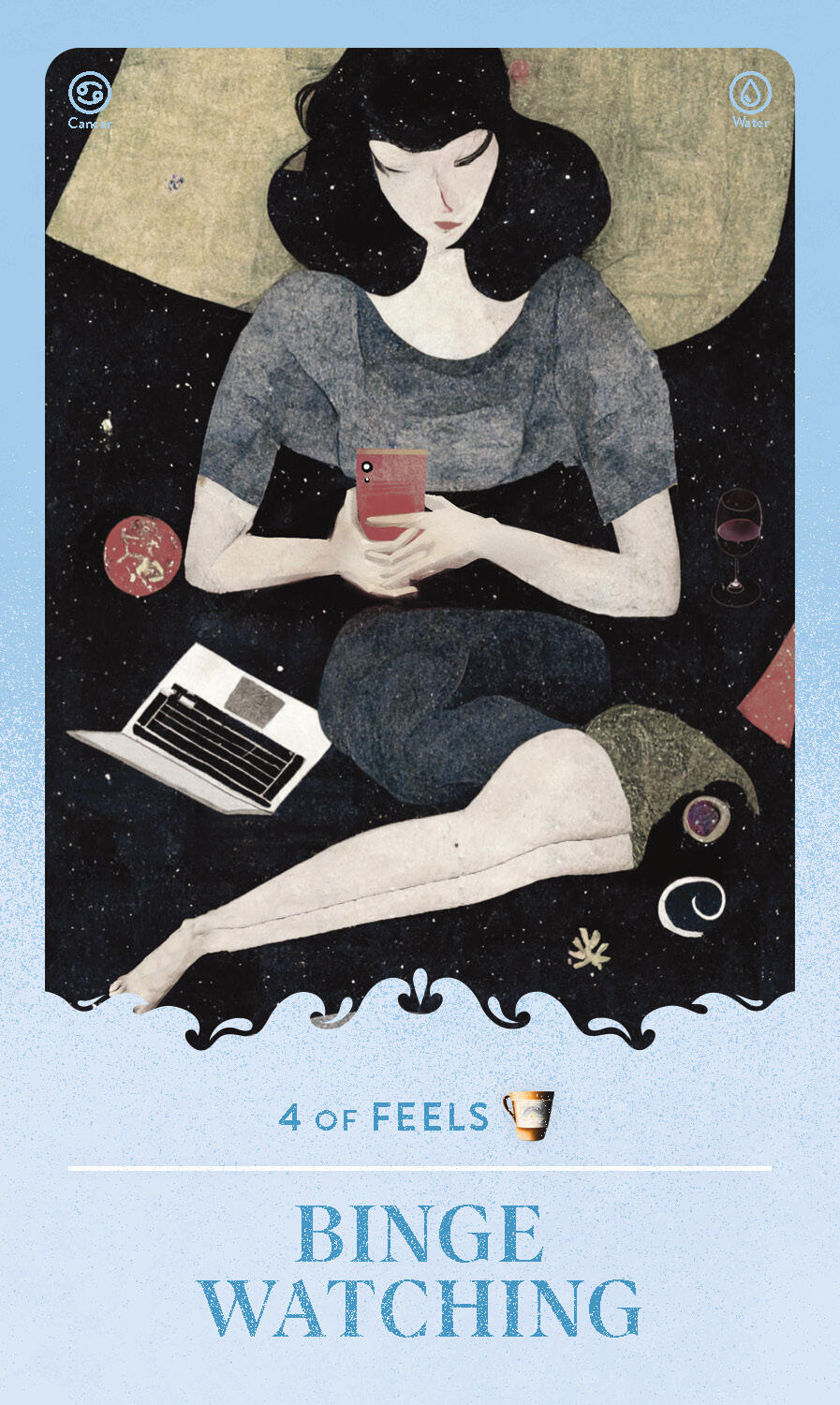 • Anything but basic: The 78 cards in this deck feature the Major and Minor Arcana in bold, darkly dreamy artwork that evokes the Rider–Waite​ tarot deck illustrations, updated for the chronically online generation. Each card and suit has been reimagined as an archetype of life for 80s and 90s kids, from The Millennial (The Fool) and Student Loans (Death) to Vibes (Wands) and Feels (Cups).