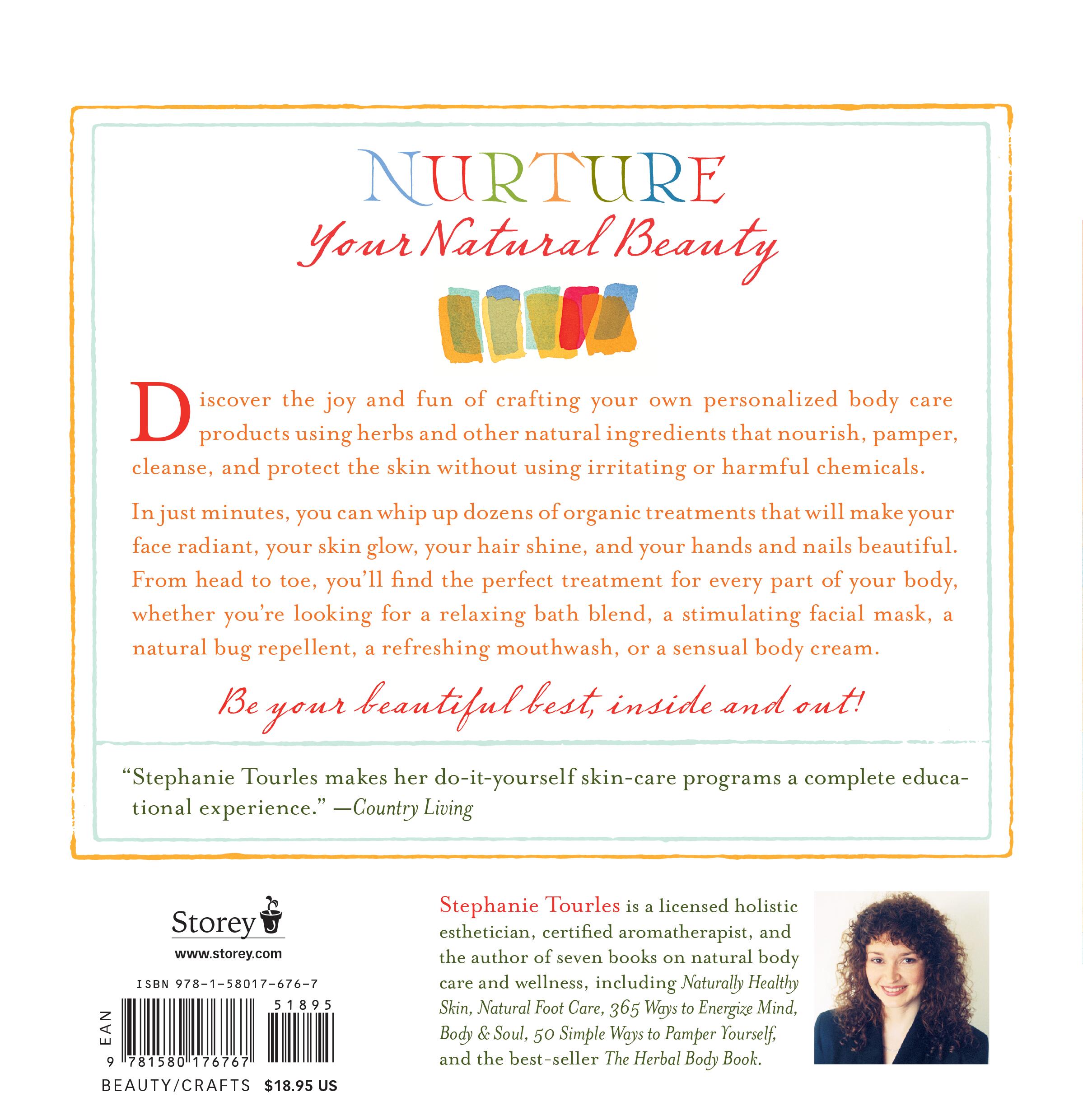 Discover the joys of all-natural body care. Stephanie Tourles shows you how to use fruit, flowers, herbs, and minerals to craft healthy products that promote radiant skin, strong nails, shiny hair, and an elevated mood. Pamper yourself from head to toe with products like Strawberry Cleanser, Pineapple Sunflower Scrub, and Almond Rose Body Lotion. Gentle on your skin and free of harsh chemicals found in commercial products, you’ll want to indulge yourself over and over with these luxuriously aromatic bath blends, face masks, and body scrubs.