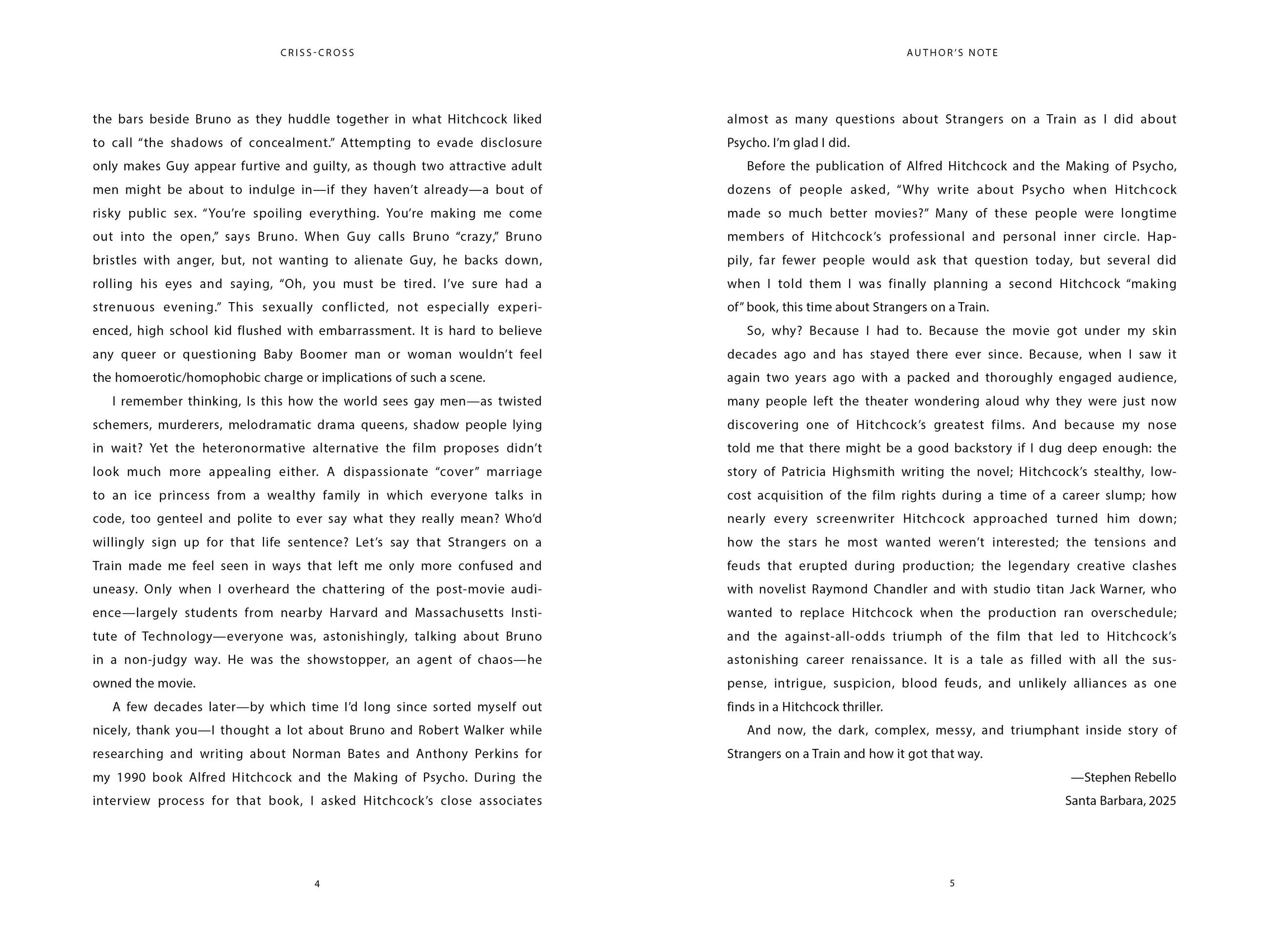 “Criss-Cross, Stephen Rebello’s meticulously detailed study of [Strangers on a Train], contains everything a casually interested reader might want to know but also probes deeply enough to surprise and satisfy those who consider themselves aficionados of the director’s work.”Alain Silver, coauthor of From the Moment They Met It Was Murder