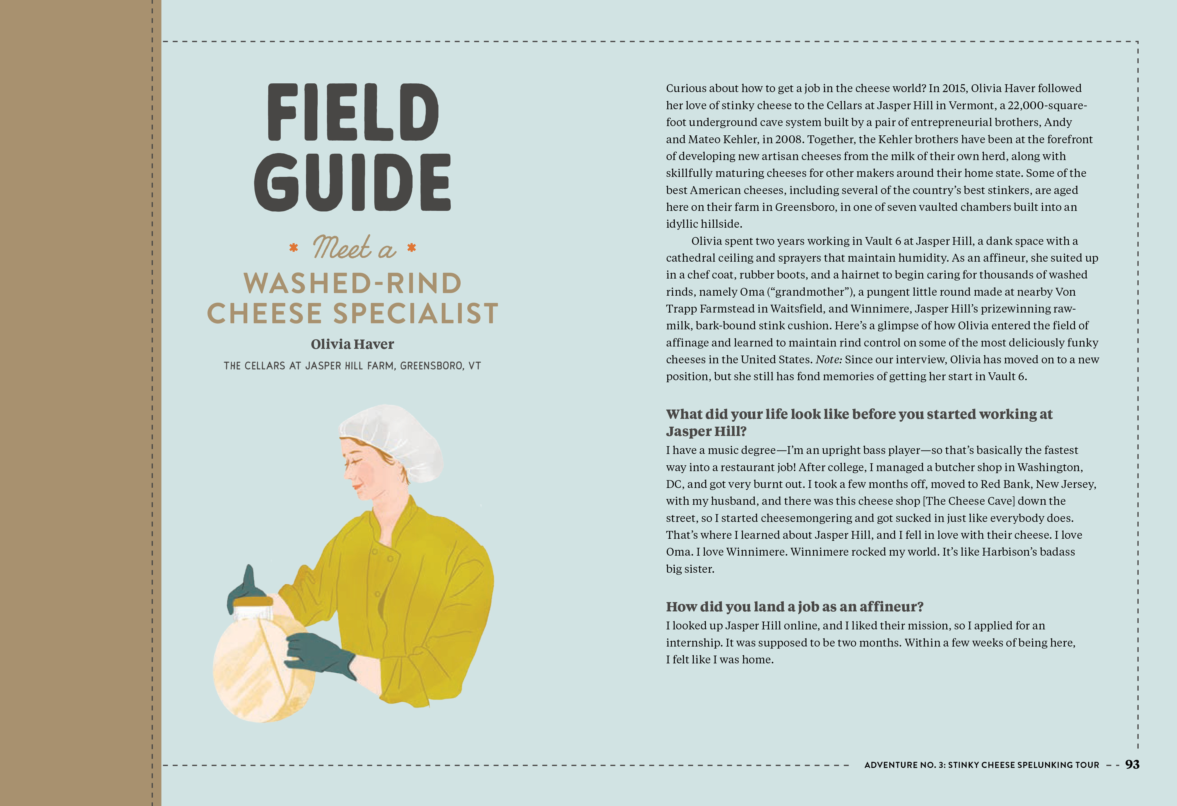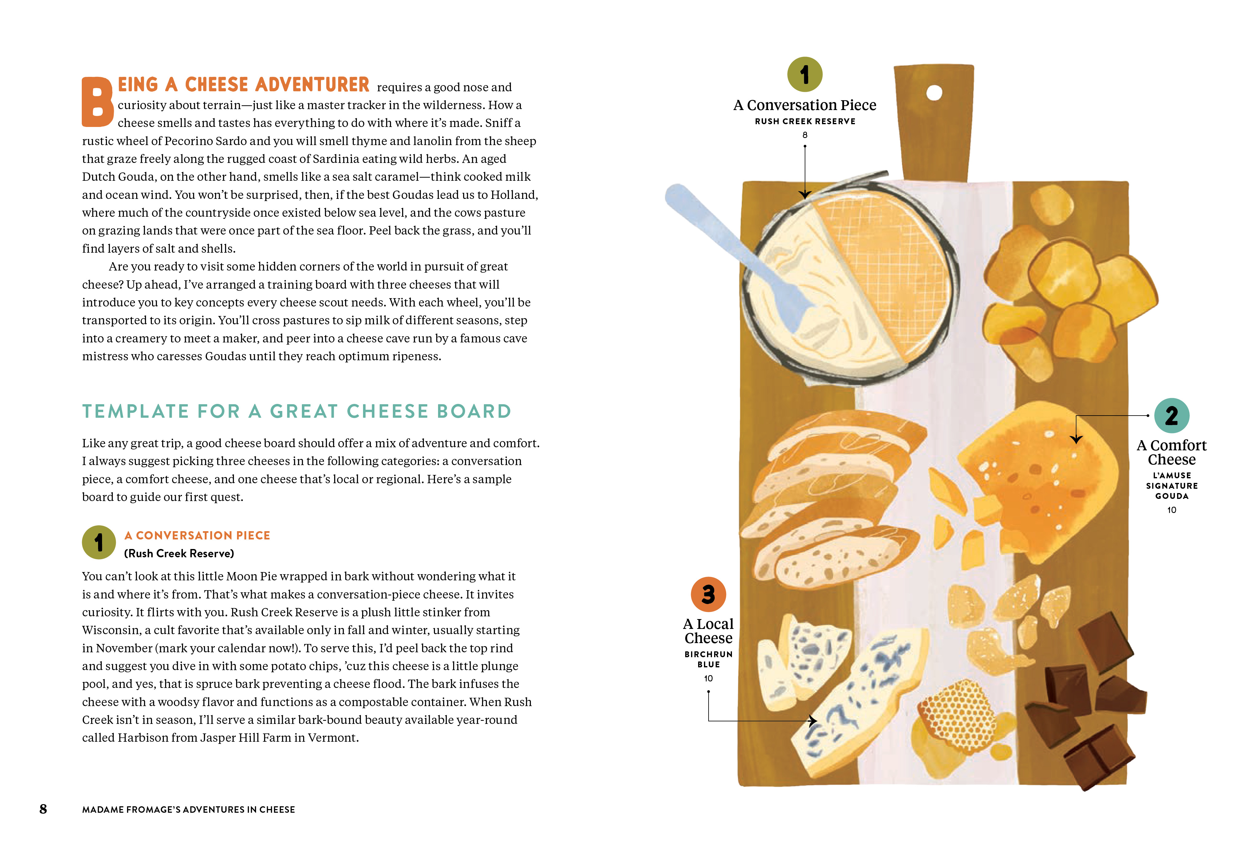 Structured around the concept of eight tasting journeys, Madame Fromage takes us on tours through the cheese world. We skydive into fresh cheeses, like chevres, ricotta, and buffalo mozzarella. Trek through the Alpines, with its Emmentalers and Gruyeres. Go spelunking into stinky cheeses like Taleggio, Pont-l’Eveque, and the rank Langres. Take a geological adventure with aged cheeses, including Parmigiano Reggiano and Manchego, and hop on a blue cheese rock ’n’ roll tour—with their piercings and weird markings, these funky gorgonzolas, Roqueforts, and Stiltons are the rock stars of the cheese world. They also pair well with bourbon and elevate a burger, not to mention a wedge salad.