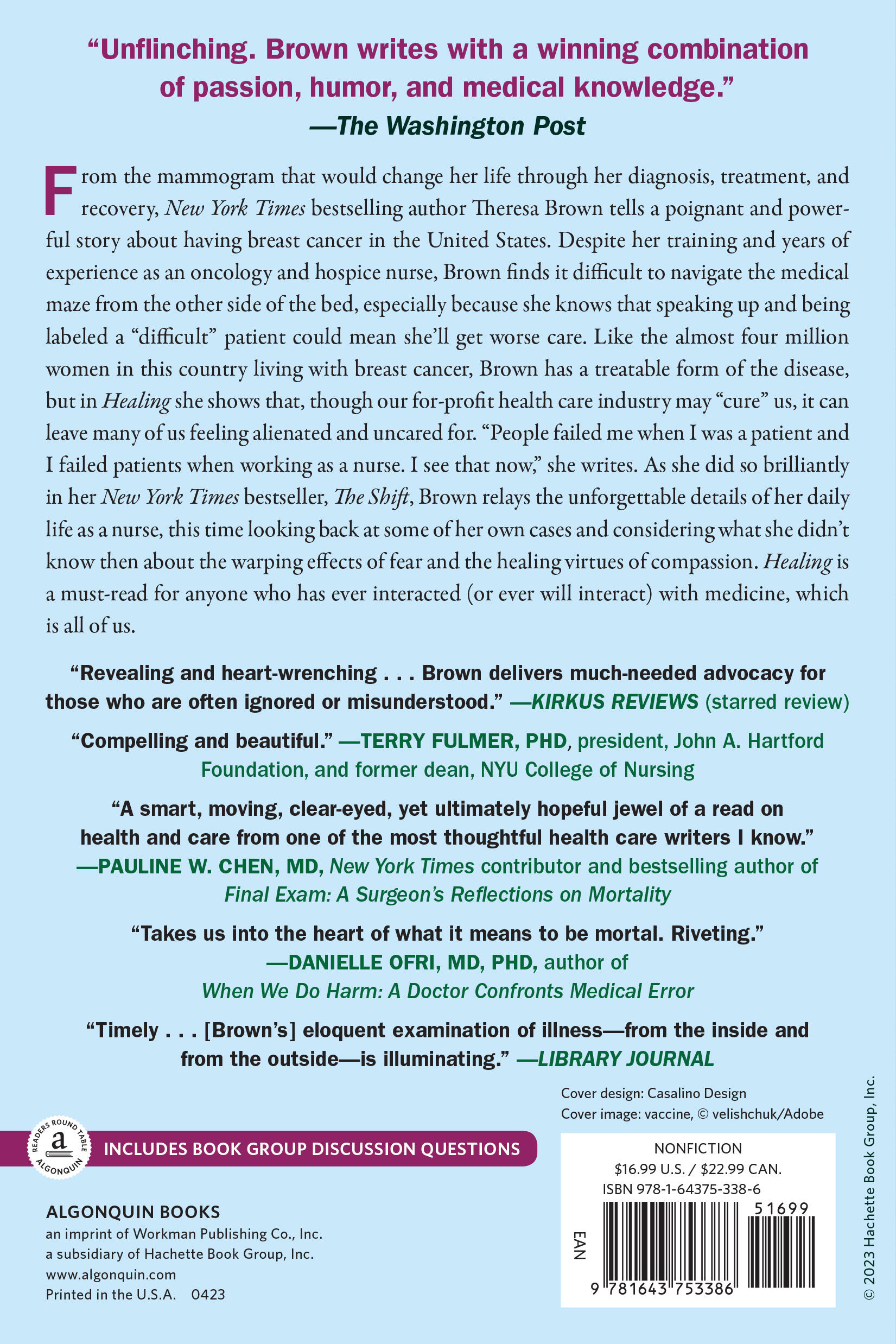 “A stunning book that helped me understand how to survive a serious illness and how to understand hospitals in general. Theresa Brown is also a hell of a good writer.”Library Journal“Healing should be read by everyone, not just those facing cancer. Brown experiences both grief and revelation, and the beauty of her book is that we learn so much about hope and fear and coping, about living and dying and everything in between.”—Bobbie Berkowitz, PhD, RN, FAAN, Emeritus Dean, Columbia University School of Nursing “By relating her own intimate experiences with cancer, Brown provides a candid critique of a system that sometimes fails people when they are most vulnerable. A brave and rare book that advocates for greater compassion in healthcare.”—Pamela F. Cipriano, PhD, RN, FAAN, Dean, University of Virginia School of Nursing “Riveting and wrenching, Theresa Brown’s memoir takes us into the heart of what it means to be mortal. Examining illness from the inside and the outside, Brown’s sure hand provides a clear-eyed narrative that’s both intimate and harrowing.”—Danielle Ofri, MD, PhD, editor of Bellevue Literary Review and author of When We Do Harm: A Doctor Confronts Medical Error “A compelling and beautiful book. Brown’s personal depth in her narrative and remarkable tie-ins across many facets of history and literature draw the reader in and make it clear how much work we have to do in healthcare to get to reliable, humane practices.”—Terry Fulmer, PhD, President, John A. Hartford Foundation, former Dean, NYU College of Nursing “In her wide-ranging examination of fear, illness, and life in what she calls ‘cancer’s shadow,’ Brown never fails to reveal her own humanity. Healing is a book not only for breast cancer patients and their loved ones, but for anyone else who cares about caring. Most importantly, Brown shows us the importance of perspective: how the value of compassion becomes infinitely greater when it becomes your own life that needs saving.”—Chicago Review of BooksPraise for The Shift: “An engrossing human drama . . . The Shift is one nurse's story, but it contains elements of every nurse's experience." –The Wall Street Journal “The Shift . . . should be required reading for all incoming medical and nursing students--or anyone who is a patient or visitor in a hospital . . . Her story is riveting in the exacting way she recounts the way her day unfolds.” –Pittsburgh Post-Gazette “Brown does an excellent job of taking us moment by moment through her day . . . keeping the narrative flowing. The reader feels her affection and deep sense of responsibility for her patients." –Minneapolis Star-Tribune