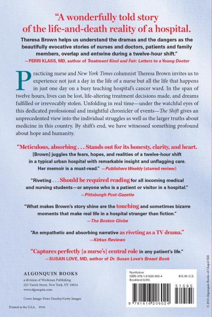 Practicing nurse and New York Times columnist Theresa Brown invites us to experience not just a day in the life of a nurse but all the life that happens in just one day on a busy teaching hospital’s cancer ward. In the span of twelve hours, lives can be lost, life-altering treatment decisions made, and dreams fulfilled or irrevocably stolen. Unfolding in real time—under the watchful eyes of this dedicated professional and insightful chronicler of events—The Shift gives an unprecedented view into the individual struggles as well as the larger truths about medicine in this country. By shift’s end, we have witnessed something profound about hope and humanity.