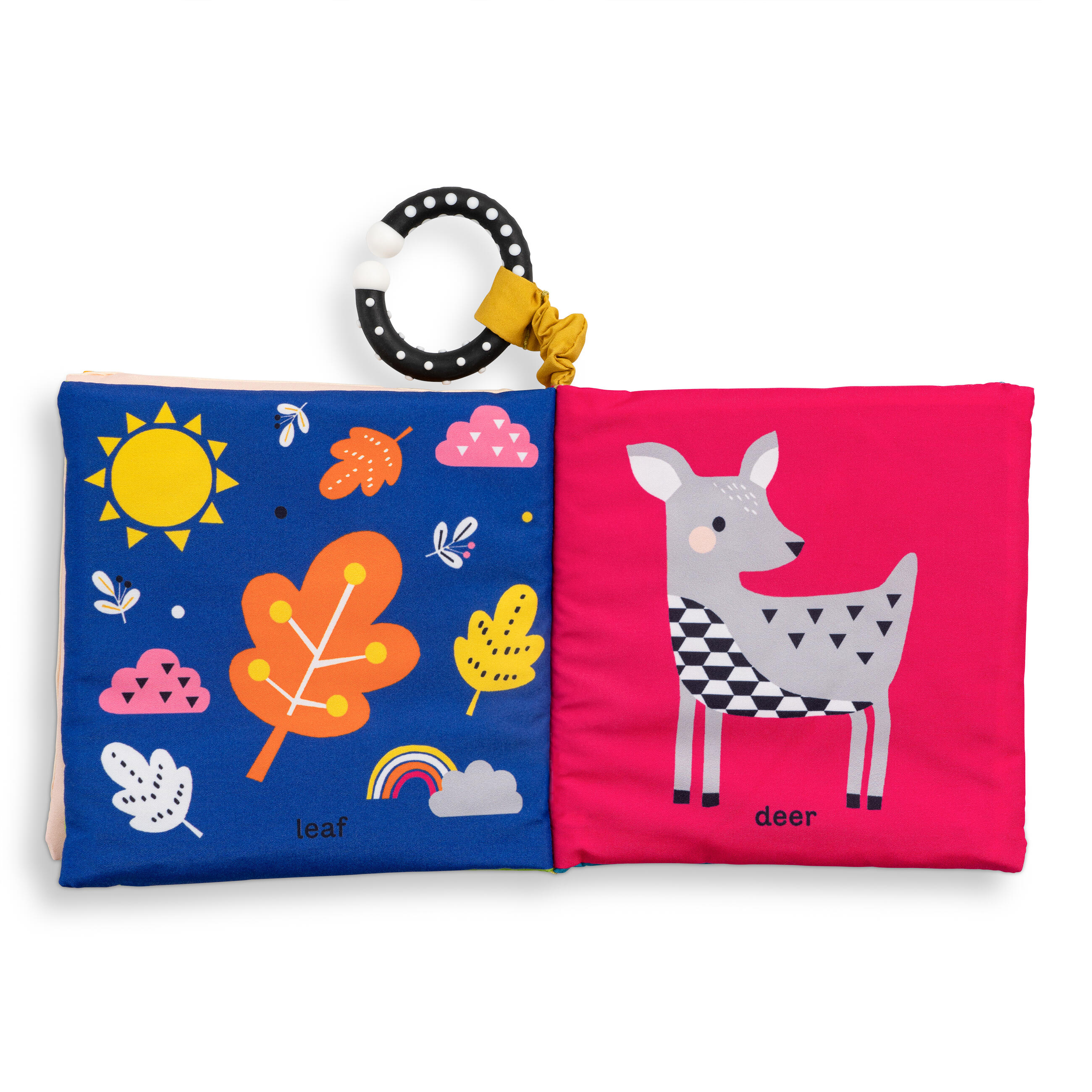 Introduce babies and toddlers to the forest in this soft book with enticing crinkly pages. Through bright, colorful illustrations, little ones will learn first words like acorn, fox, and leaf while developing their senses and fine motor skills. Perfect for repeat readings (and crinkling!), this cloth book packaged with a teether is the ideal gift for any young child and caregiver.