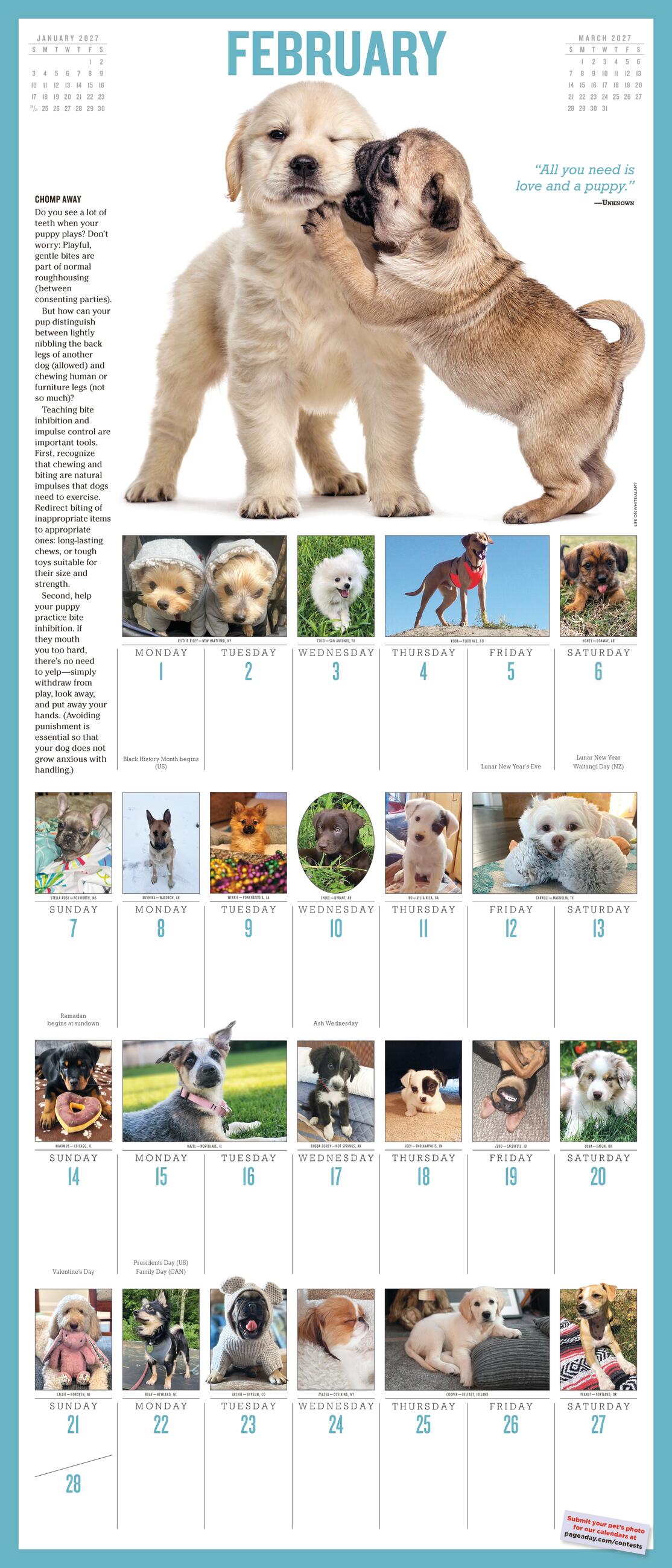 - DOG-GONE ADORABLE: The cuddly, snuggly, and sometimes silly winners of our 2027 Puppy Calendar contest star in this joyful calendar. Meet Corgis, Golden Retrievers, Beagles, and more!