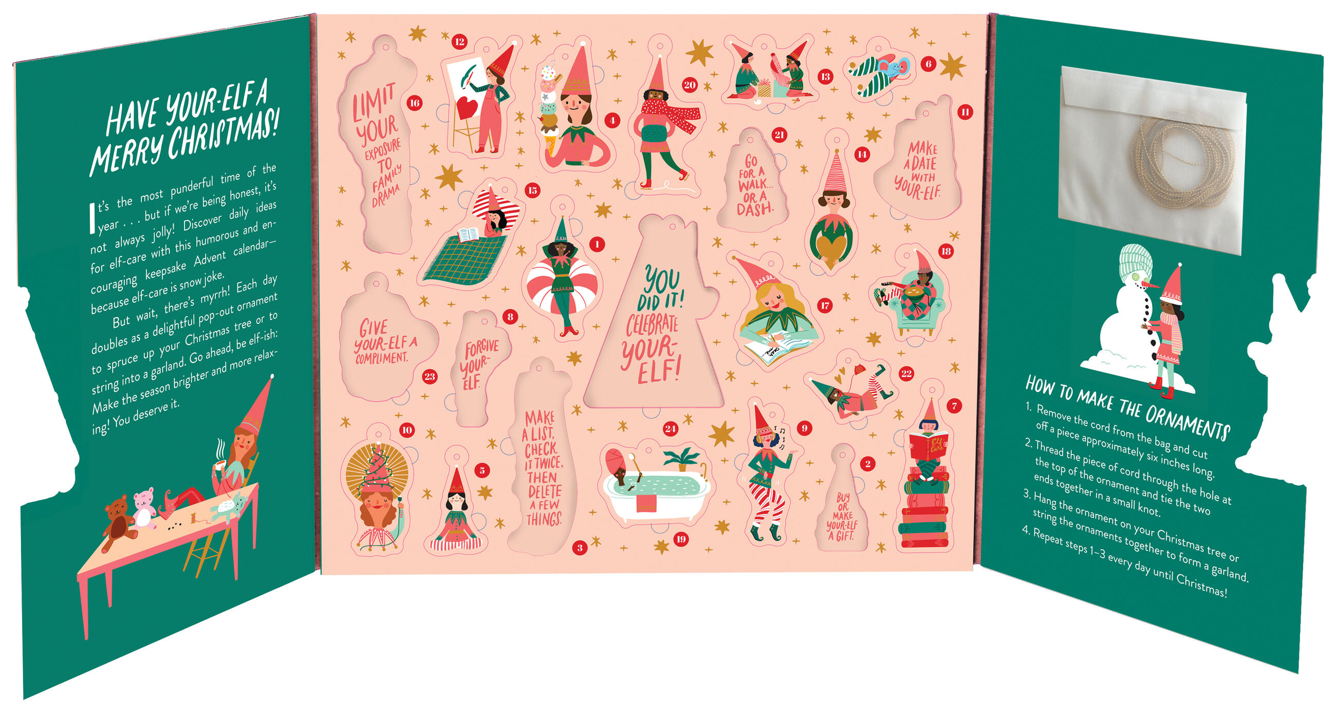 Advent calendar combines the spirit of the season with self-care—er, elf-care. Count down the days to Christmas with 24 whimsical, seasonal ideas for staying jolly and relaxed through the stress of the holidays. Go for a walk . . . or a dash! Buy or make your-elf a gift. Have a silent night. Each day of this keepsake calendar doubles as a pop-out ornament to spruce up your Christmas tree or string on a garland using the included gold cord. Printed on responsibly sourced paper.
