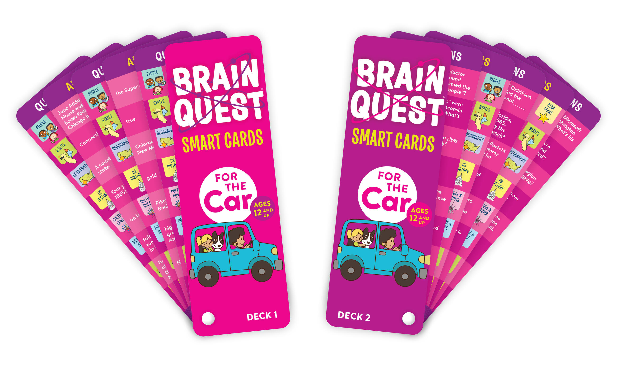 Brain Quest For the Car Smart Cards is a fast-paced Q&A trivia challenge that will make every road trip a learning adventure! Kids ages 12 and up can learn about national landmarks, notable Americans, and natural wonders as they pass the time in the backseat. Plus, state capitals, historical milestones, mythic figures, and more. Many answers now include background information and explanations that help put learning in context.