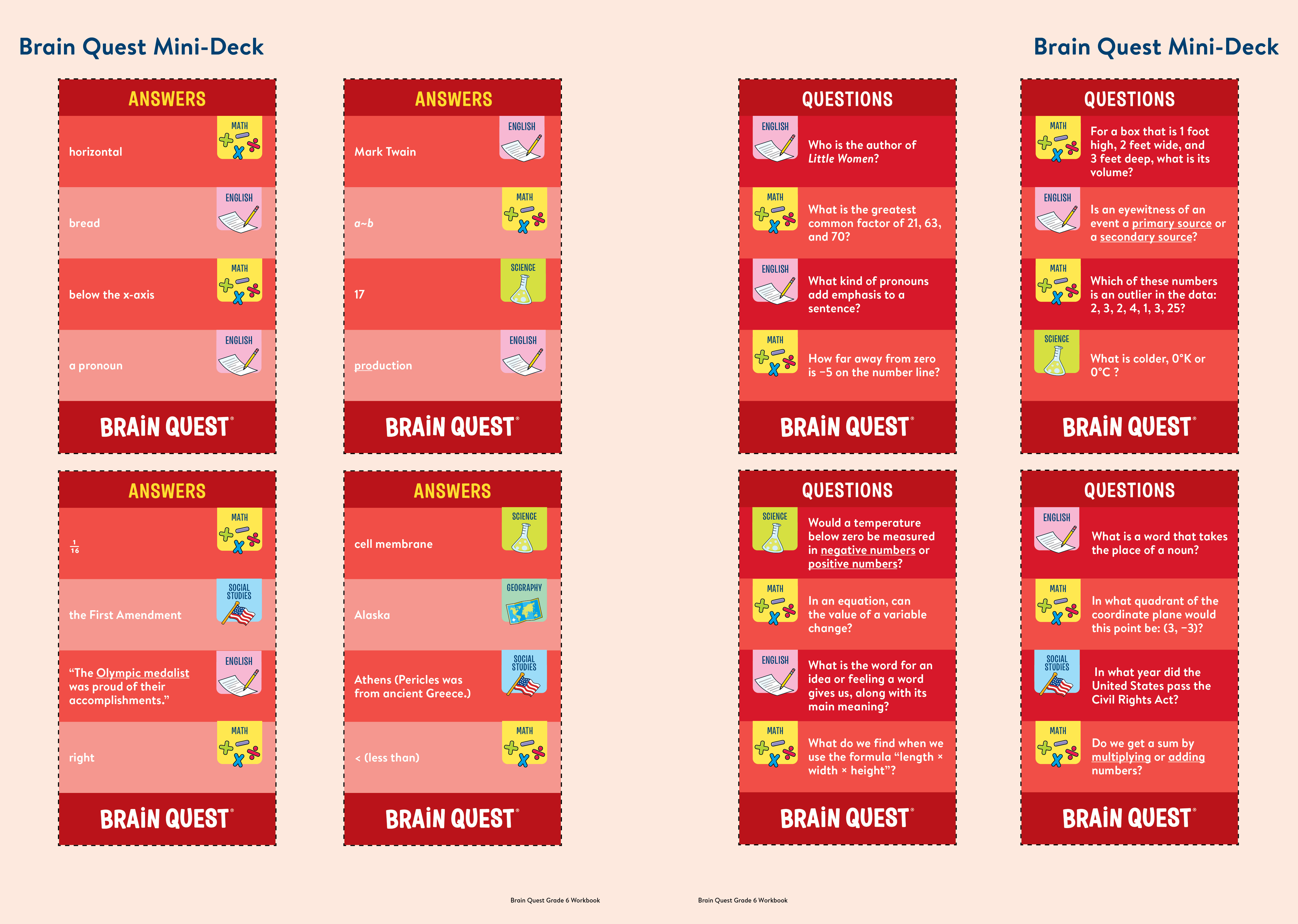 Loved by kids, teacher approved, and trusted by parents, Brain Quest Grade 6 Workbook reviews and reinforces what children are learning in the classroom in an instantly engaging, entertaining way. Each page is jam packed with fun activities, practice exercises, and games covering spelling and vocabulary, language arts, math word problems, multiplication and division, fractions and decimals, geometry and measurement, statistics, social studies, science, and much more.