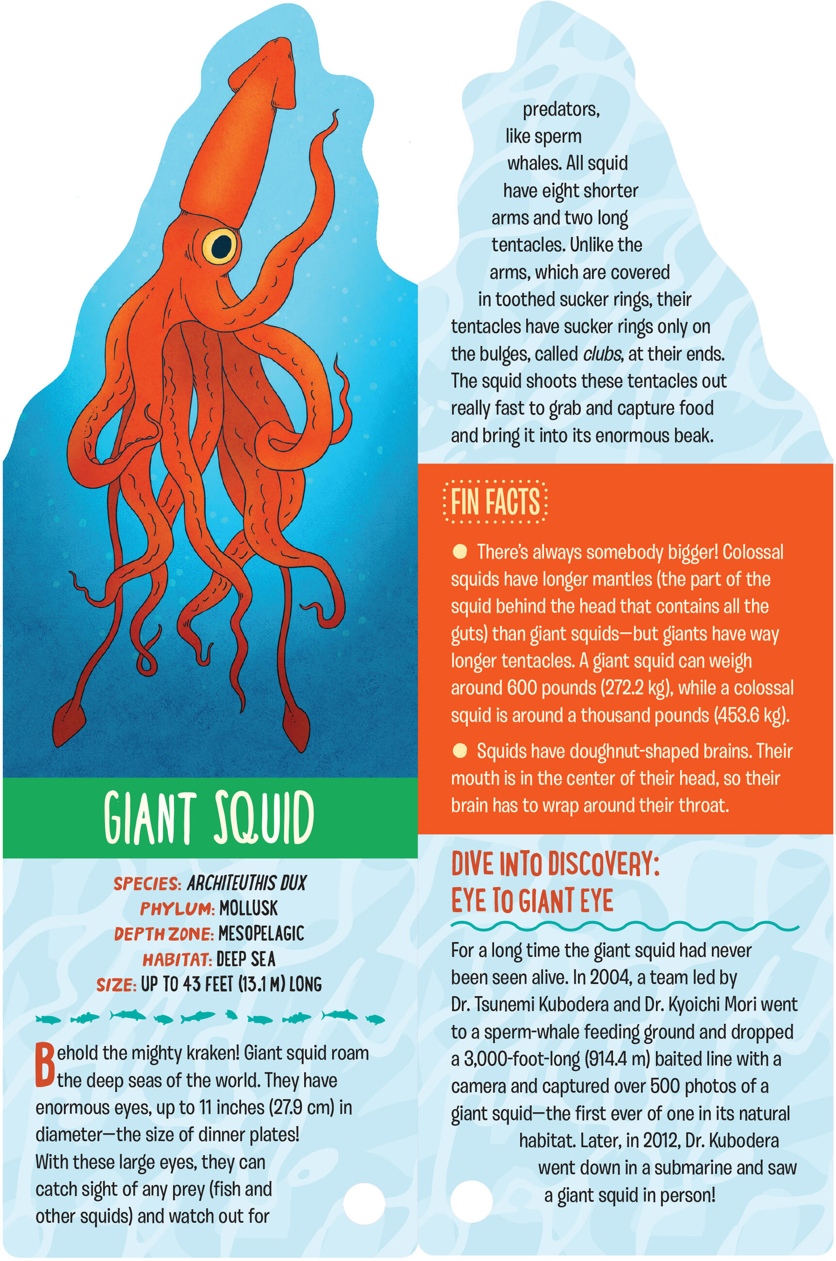 Meet Cuvier’s beaked whale, a mammal that holds the record for holding its breath underwater— 3 hours, 42 minutes! Giant kelp, which can grow up to 2 feet every day— that’s right, 2 feet! And the ancient coelacanth—often called a “living fossil”—which has changed very little in 400 million years and was once assumed to be extinct. With bold illustrations, each card in Fandex Kids: Oceans includes information about the creature’s size, habits and habitat, plus bonus Fin Facts.