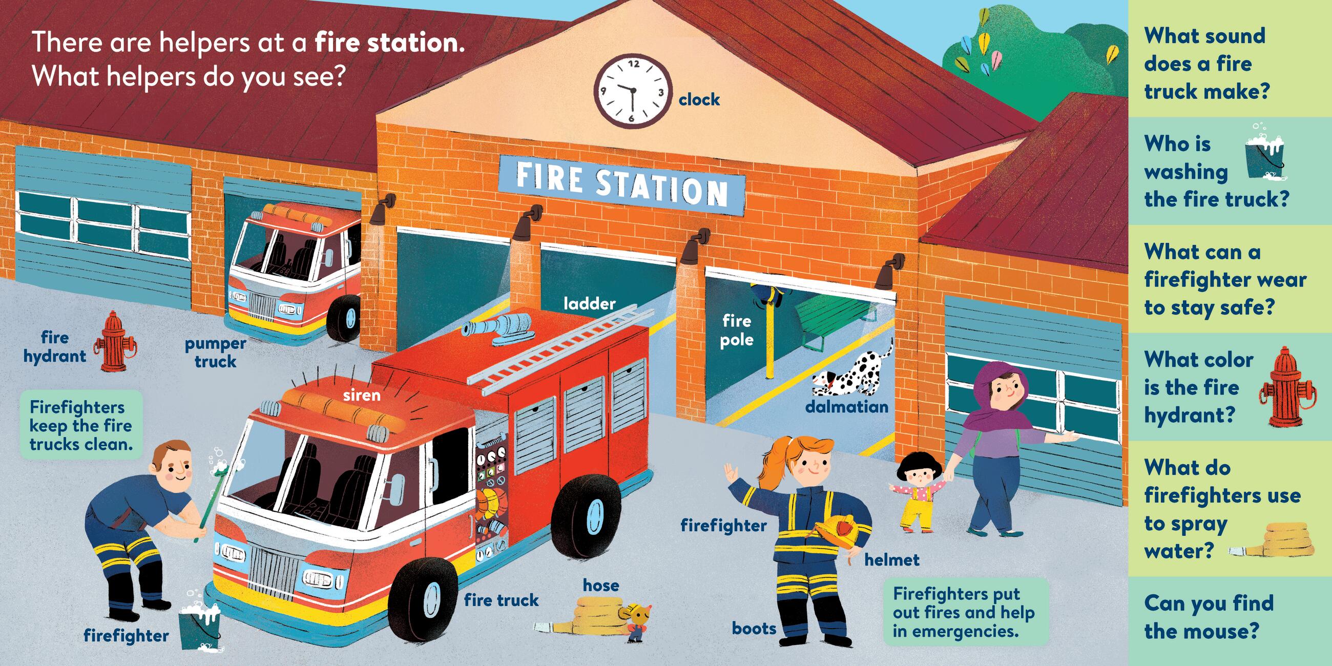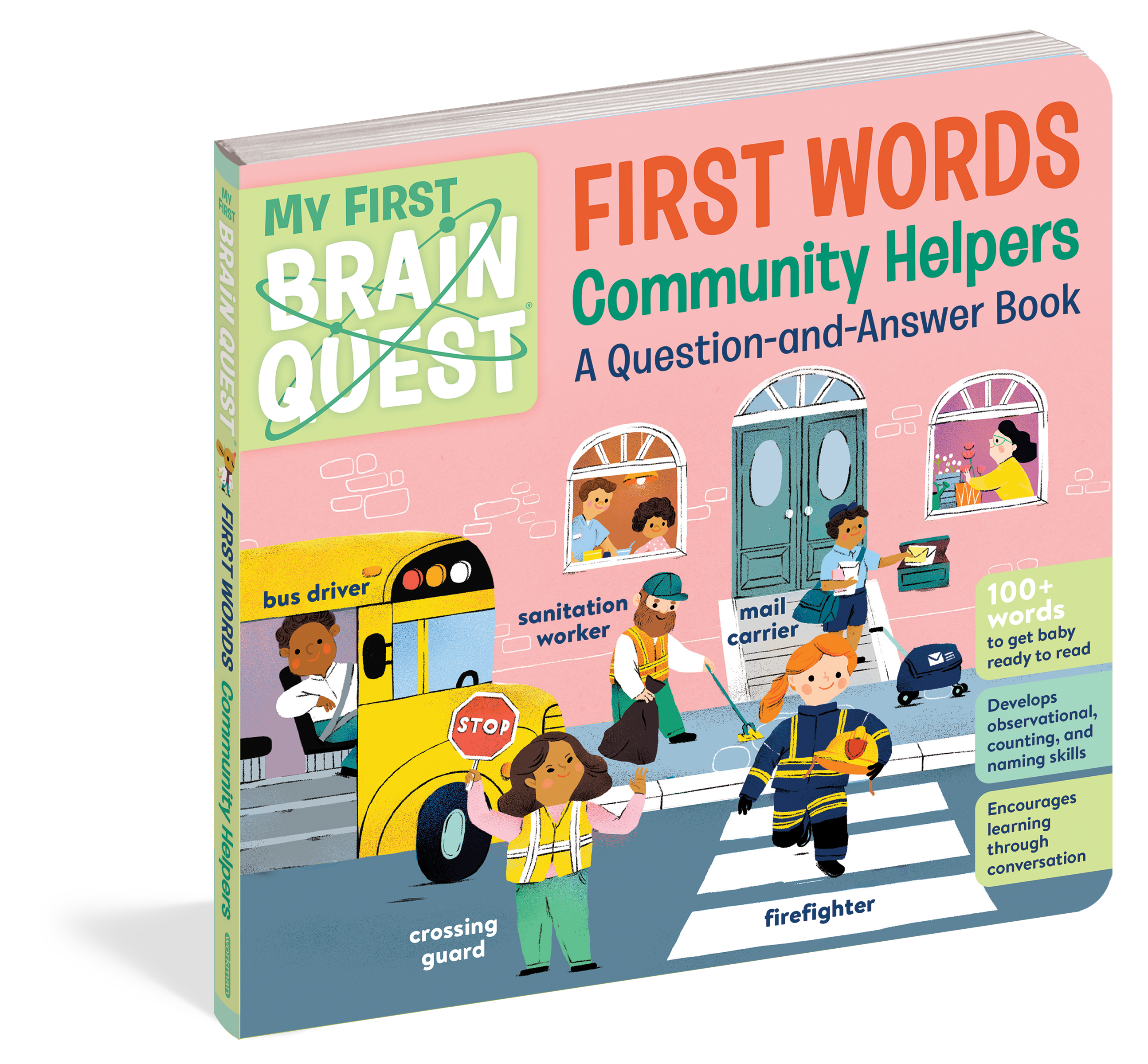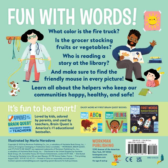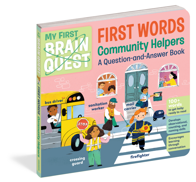My First Brain Quest First Words: Community Helpers introduces baby to more than 100 foundational vocabulary words from scenes in bustling neighborhood where helpers of all kinds—from crossing guards to EMTs and librarians to veterinarians—are hard at work. In addition to labeled illustrated objects and named helpers, each spread includes questions that encourage dialogue between caregiver and child, and captions that explain how helpers contribute to the community. And don’t forget to find the friendly mouse hiding in every scene!