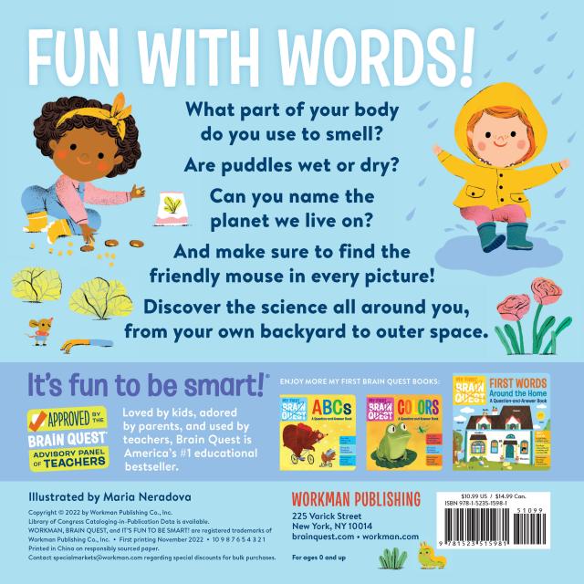 My First Brain Quest First Words: Science Around Us introduces babies and toddlers to more than 100 STEM-related vocabulary words in their world—in the backyard, at the doctor’s office, at the beach. Each scene features labeled illustrated objects as well as brief captions that help to introduce STEM concepts and help put into context, alongside questions that encourage conversation between reader and child. Children have fun naming, counting, and comparing.